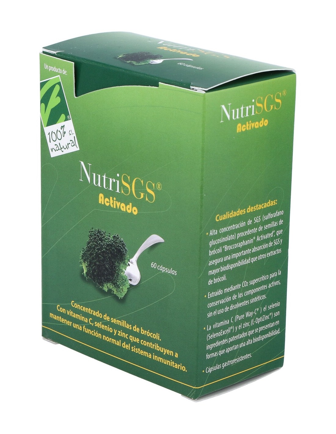 Concentrado de semillas de brócoli, las más ricas en su principio activo: Sulforafano glucosinolato (SGS). Enriquecido con vitamina C, selenio y zinc en sus formas más biodisponibles, que contribuyen al funcionamiento normal del sistema inmunitario y la protección de las células frente al daño oxidativo.
