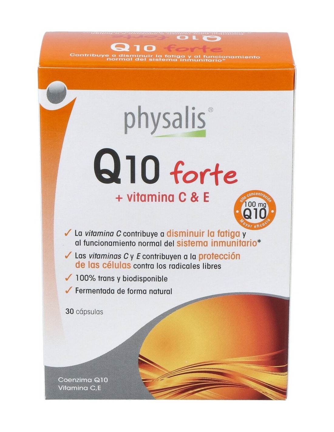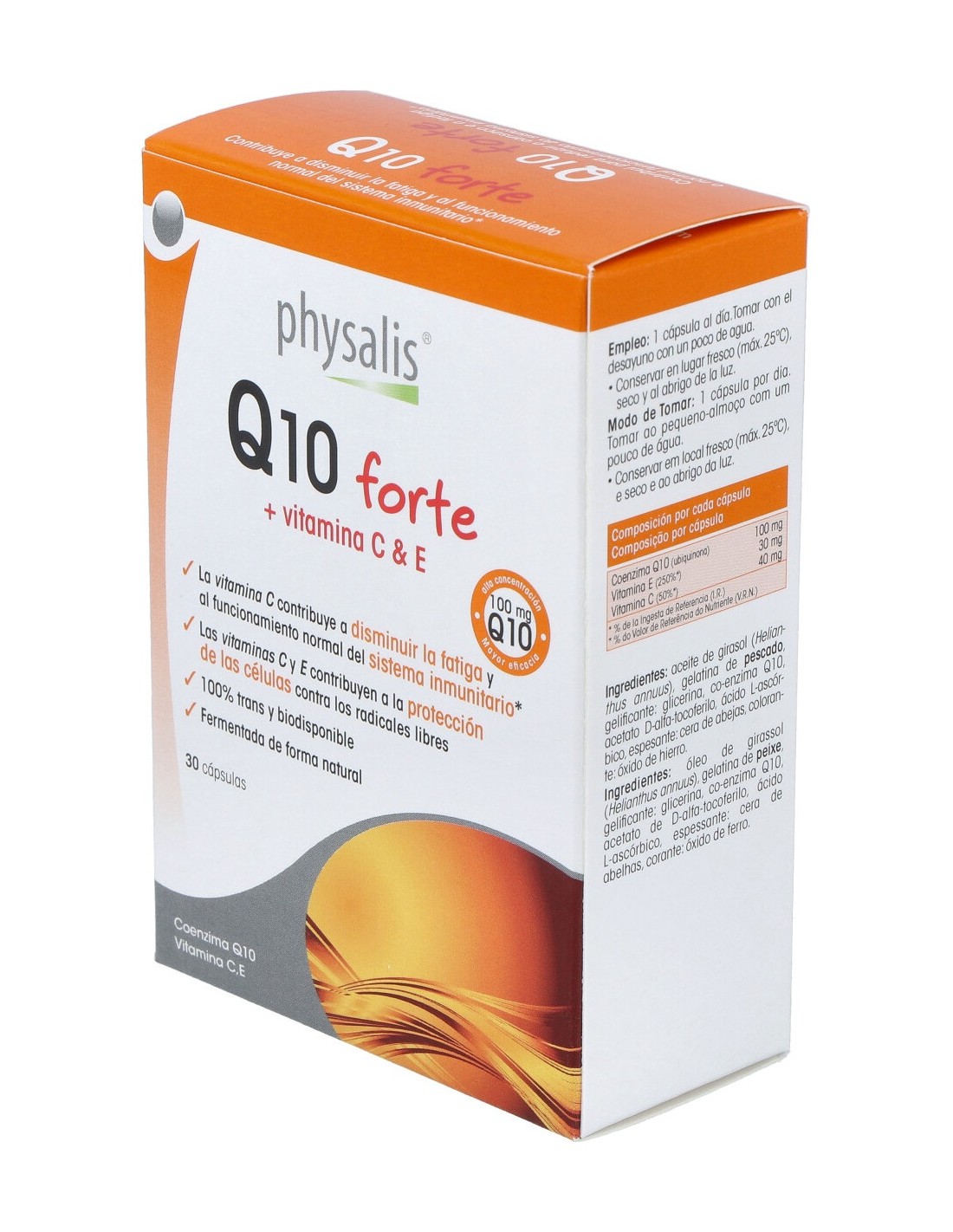 Co-Enzima Q10 (100 mg), Vitamina C (40 mg), Vitamina E (30 mg).