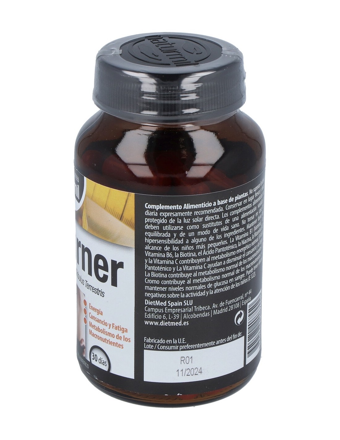 L-Carnitina base, maltodextrina, gelatina, Citrus aurantium (naranja amarga), Camellia sinensis (Té Verde; extracto seco de las hojas conteniendo al menos el 6% de cafeína), Tribulus terrestris, ácido L-ascórbico, Paullinia cupana (Guaraná; extracto seco de las semillas conteniendo al menos el 22% de cafeína), Ginkgo biloba (extracto seco de las hojas conteniendo al menos el 24% de ginkgoflavoglicósidos y 6% de lactonas terpénicas), antiaglomerante: magnesio estearato, nicotinamida, antiaglomerante: dióxido de silicio, D-pantotenato cálcico, cianocobalamina (0,1%), piridoxina clorhidrato, clorhidrato de tiamina, ácido pteroilmonoglutámico, cloruro de cromo, D-biotina, colorante: carmosina (E 122).