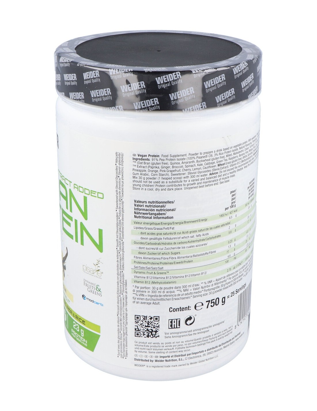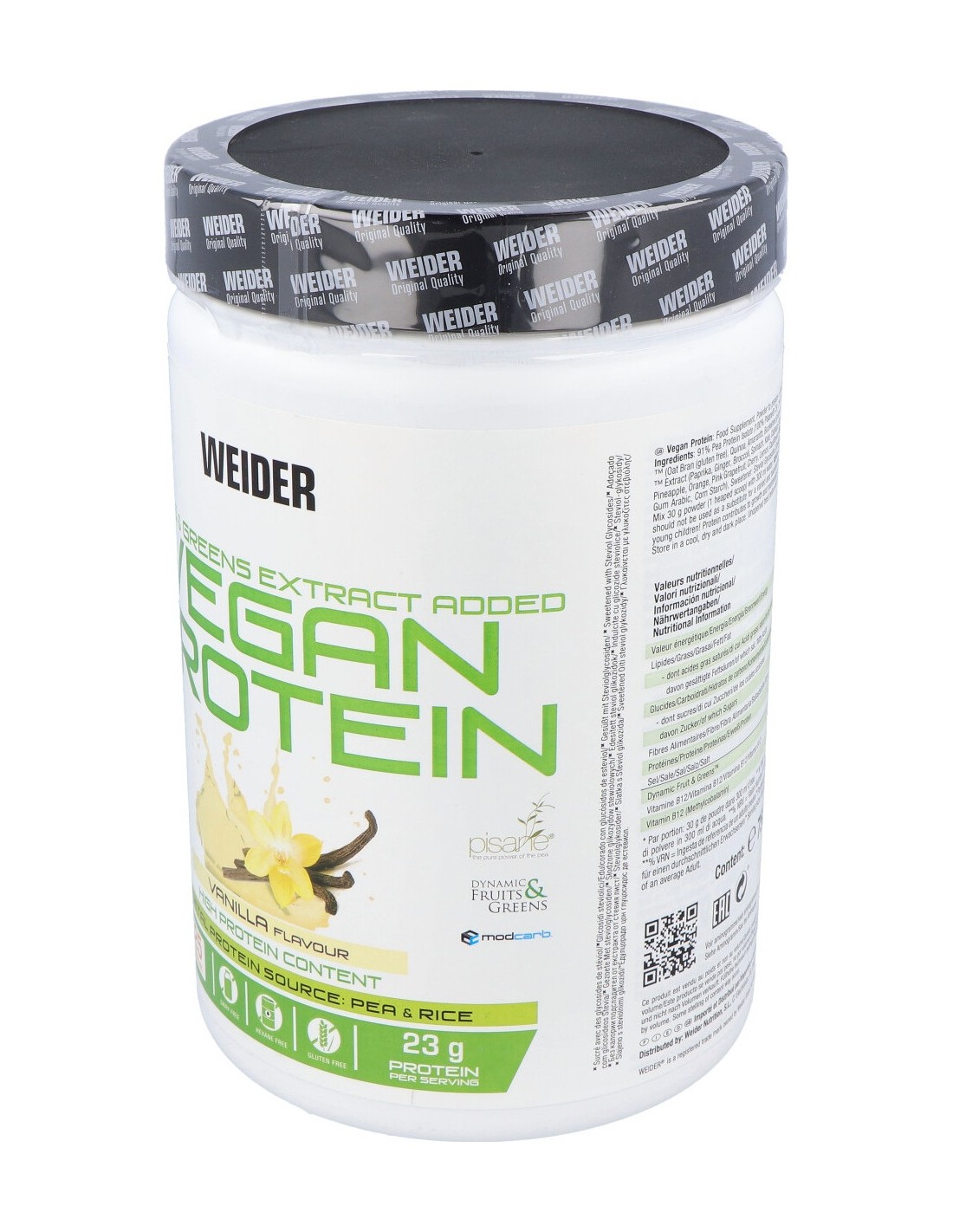 91% Aislado de proteína de guisante (100% Pisane® C9), 3% aislado de proteína de arroz, 2% ModCarb™ (salvado de avena (sin gluten), quinoa, amaranto, alforfón (sin gluten), mijo), aroma natural, colorante: cúrcuma: 0,1% Fruit & Greens™ extract (paprika, jengibre, brócoli, espinaca, col rizada, col, té verde, frambuesa, plátano, kiwi, mango, ciruela, lima, arándano, piña, naranja, pomelo rosa, cereza, limón, coliflor, trigo germinado (sin gluten), alfalfa, spirulina, chlorella, maltodextrina, goma arábiga, almidón de maíz), edulcorante: glucósidos de esteviol (extracto de stevia): cloruro de sodio.