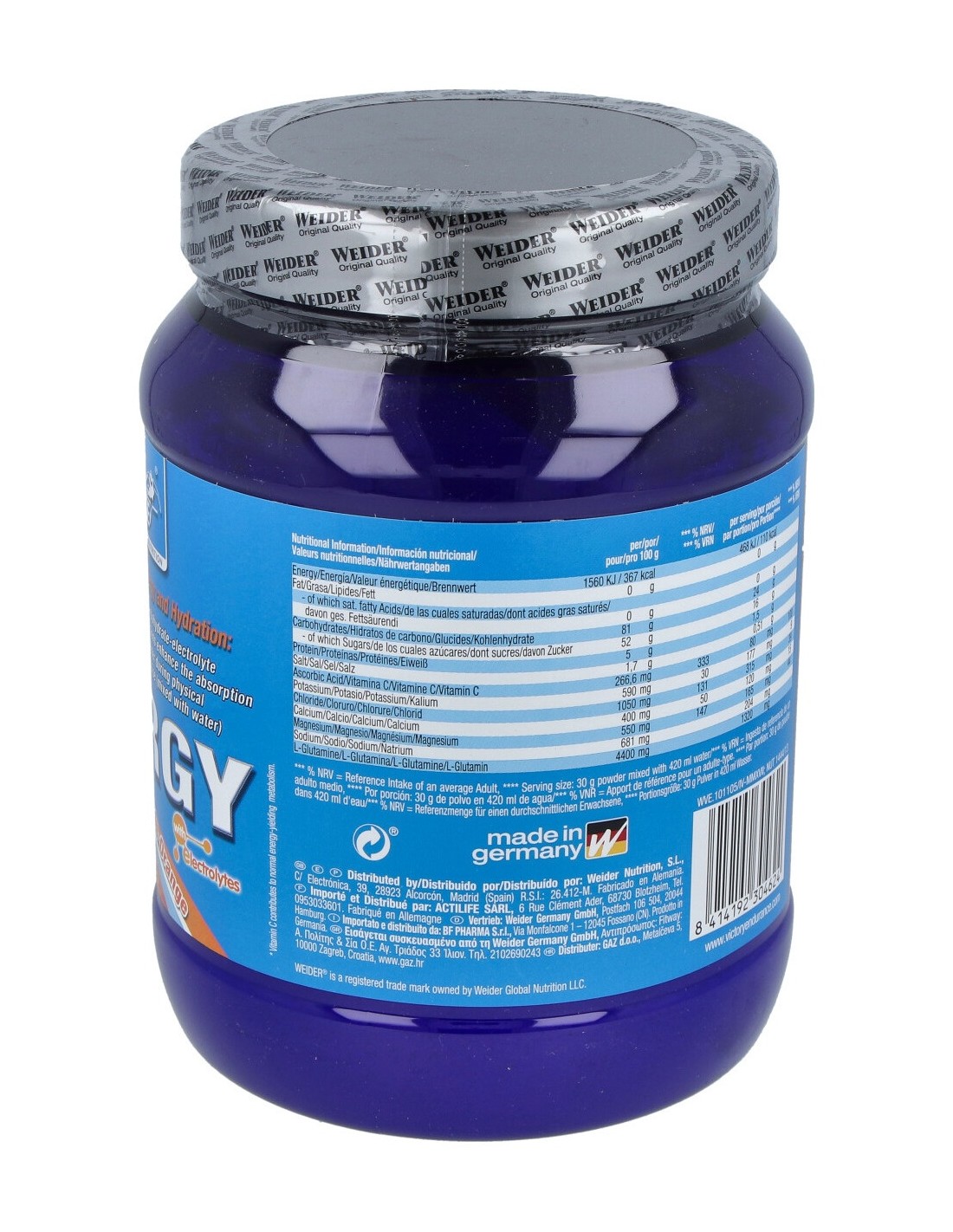 Complejo Carbo Optimum (dextrosa, maltodextrina, fructosa), acidulante: ácido cítrico: mezcla mineral (cloruro de sodio, fosfato dipotásico, hidróxido de magnesio, carbonato cálcico), L-glutamina, aroma (aroma de mandarina), colorantes: riboflavina y betacaroteno: ácido L-ascórbico (vitamina C) y edulcorante: sucralosa.