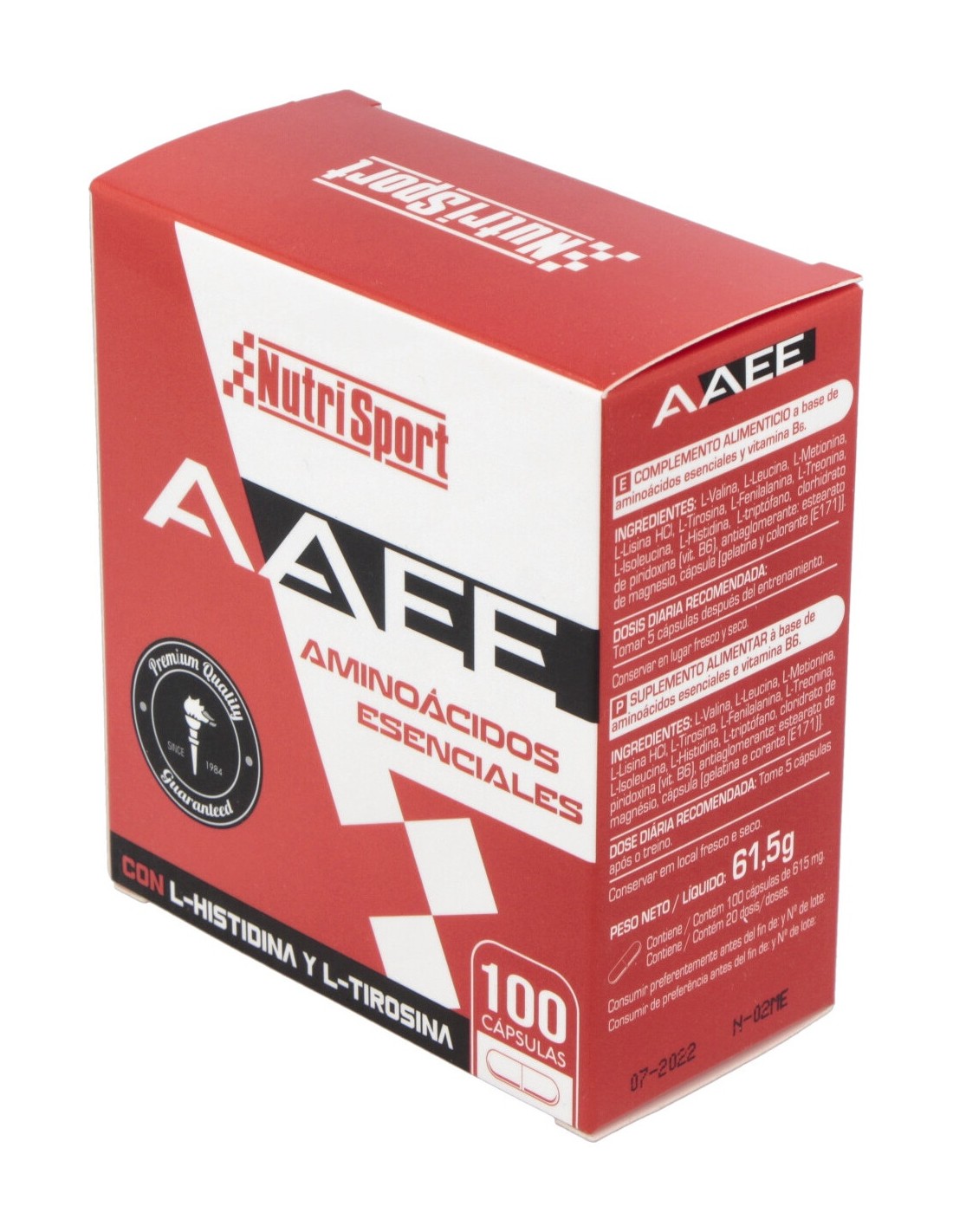 Cápsula de gelatina, L-Valina (14,5%), L-Leucina (11,7%), L-Metionina (11,7%), L-Lisina (10,4%), L-Tirosina (9,7%), L-Fenilalanina (9,1%), L-Treonina (8,4%), L-Isoleucina (7,7%), L-Histidina (5,8%), L-Triptófano (3,2%), Antiaglomerante (Estearato de Magnesio), Piridoxina Clorhidrato.