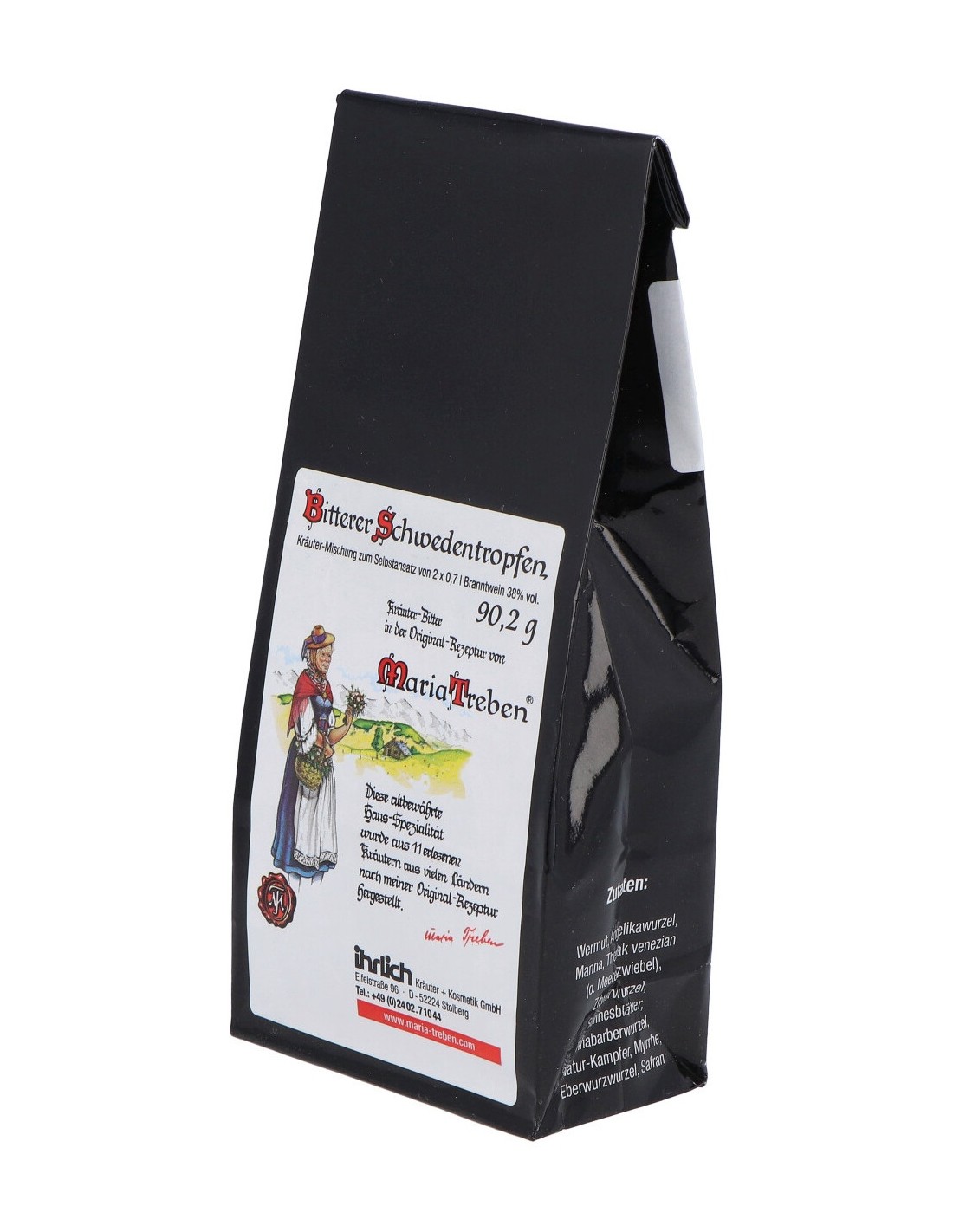 Aloe (Aloe succotrina) Ajenjo en polvo ( Artemisia Absinthium), alcanfornatural (Cinnamomum Cmphora), Azafrán (Crocus Sativus), Maná (Fraxinus Ornus), Mirra (Commiphora Myrrha), Raíz de riubarbo (Rheum Rhabarbbarum), Raíz de Cedoaria (Cúrcuma Zeodoaria Rosc), Raíz de Angélica (Angeelica Archangelica), Raíz de Carlina Vulgar (carlina Vulgaris), Sen (Cassia Acutifolia Delile), Tereaca Veneci.