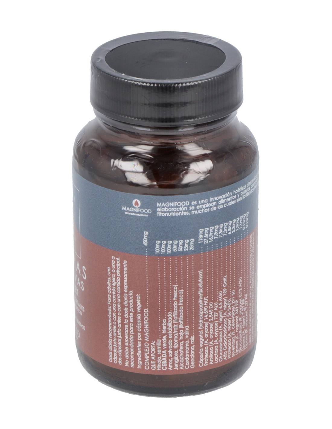 Suplemento a base de enzimas digestivas y plantas del Complejo Magnifood que apoyan el normal mantenimiento del aparato digestivo. Apto para vegetarianos y veganos.
