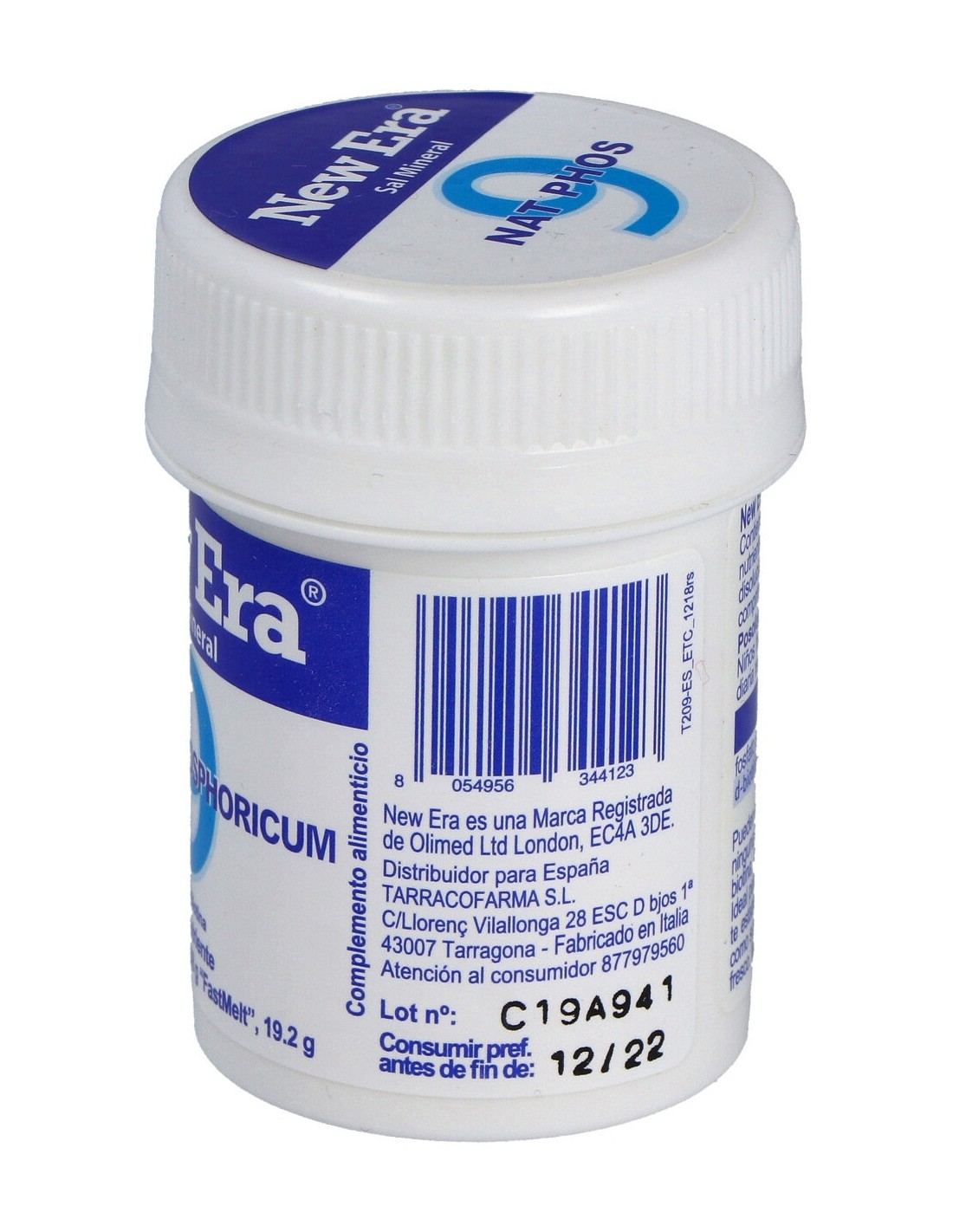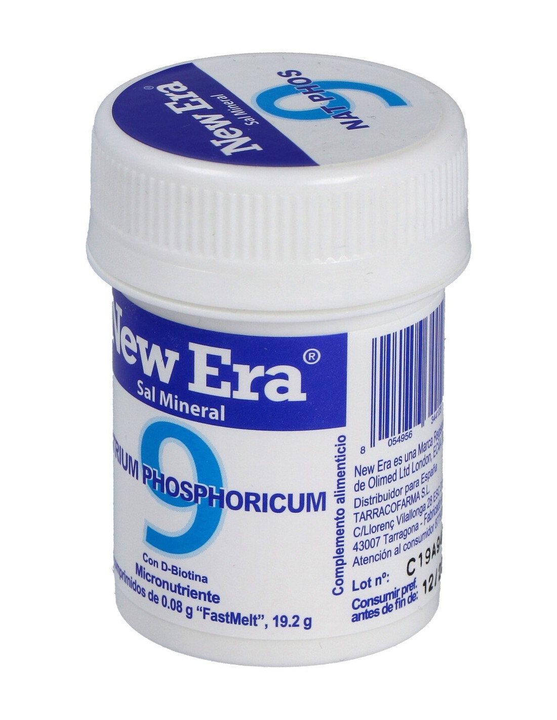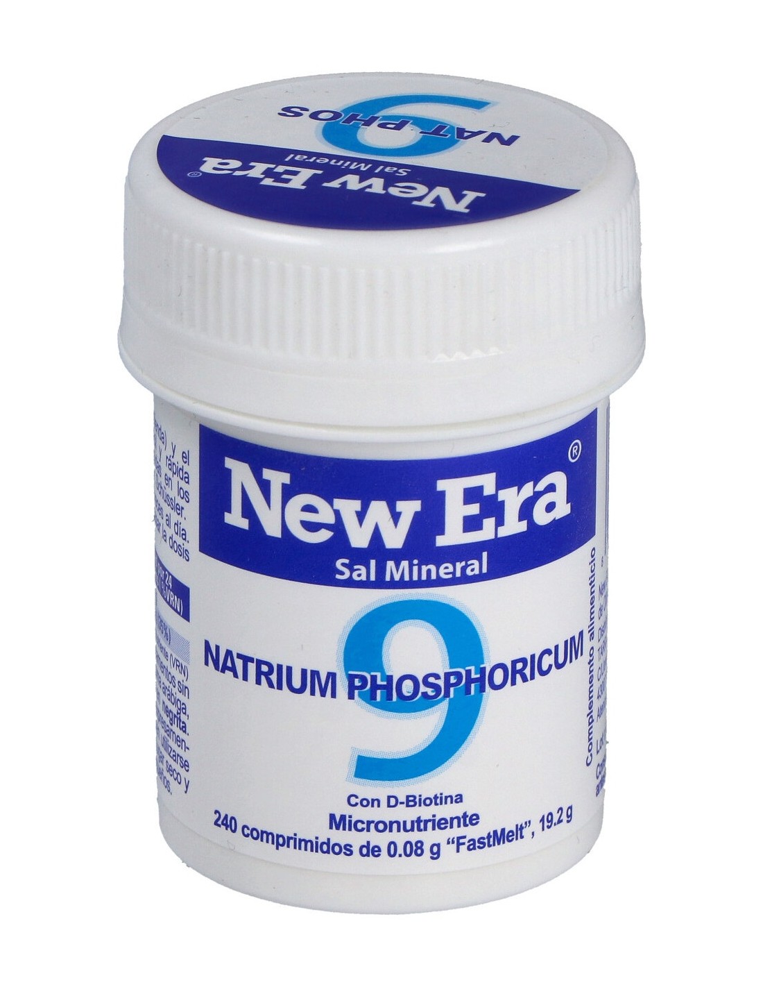 Sal de Schüssler Nr.9 Natrium phosphoricum (fosfato de sodio). Contiene partículas de sal mineral trituradas (molienda) y el nutriente esencial Biotina en comprimidos de fácil y rápida disolución ('FastMelt'). Las sales minerales contenidas en los comprimidos New Era siguen la fórmula original del Dr. Schüssler. Apto para vegetarianos.