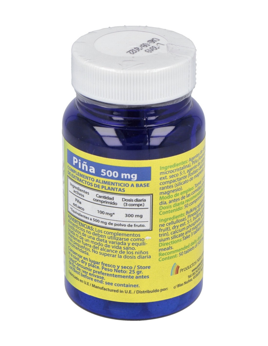 Agente de carga (celulosa microcristalina), Piña (Ananas sativa, L – fruto-) ext. seco 5:1 (100 mg, equivalentes a 500 mg de polvo de fruto), maltodextrina, agente de carga (fosfato cálcico), antiaglomerantes (silicato de magnesio y estearato de magnesio).
