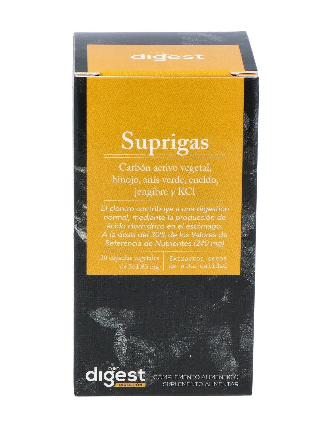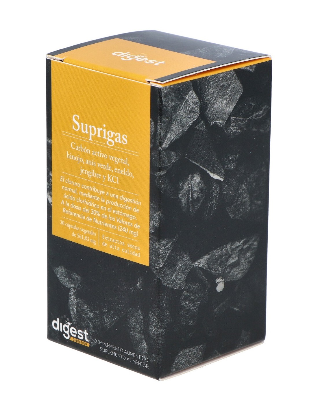 Producto a base de Carbón activo vegetal, hinojo, anís verde, eneldo, jengibre y KCl (cloruro de potasio). Apto para veganos.