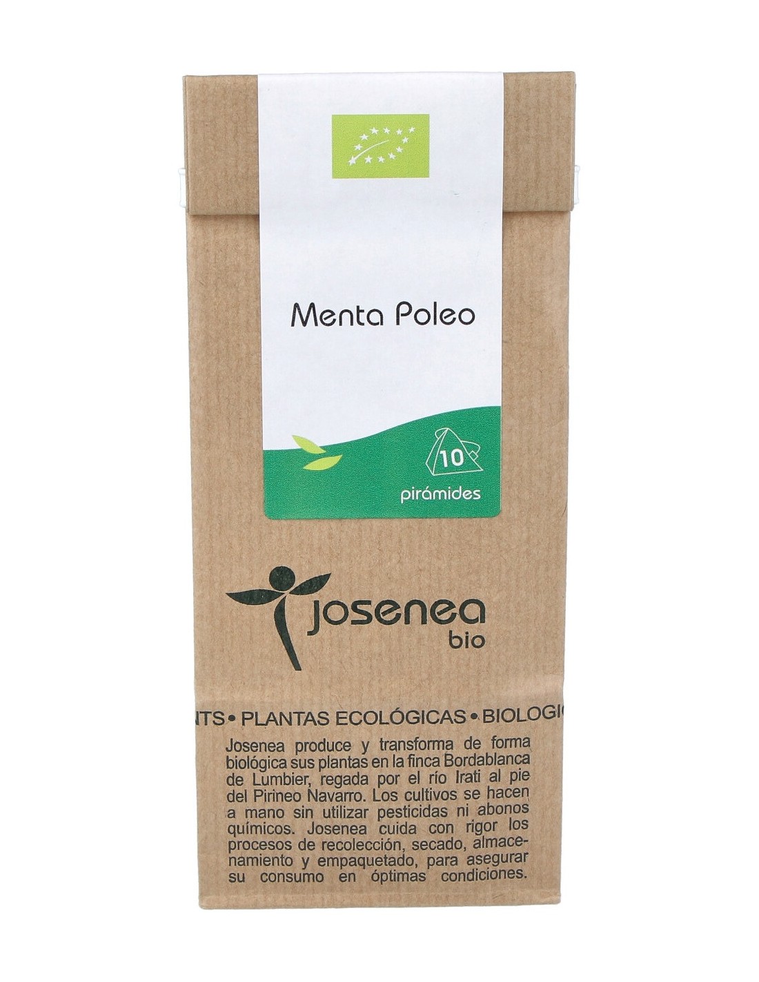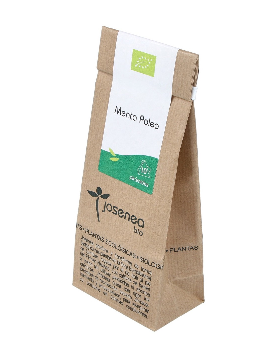 Mezcla de menta polea de la marca Josenea en formato de bolsa Kraft, producto destinado a elebaración de bebidas de infusiones. Josenea es una marca especializada en infusiones, tés y especias con certificación ecológica. Realiza el cultivo, producción y distribución de productos bio a base de plantas aromáticas.