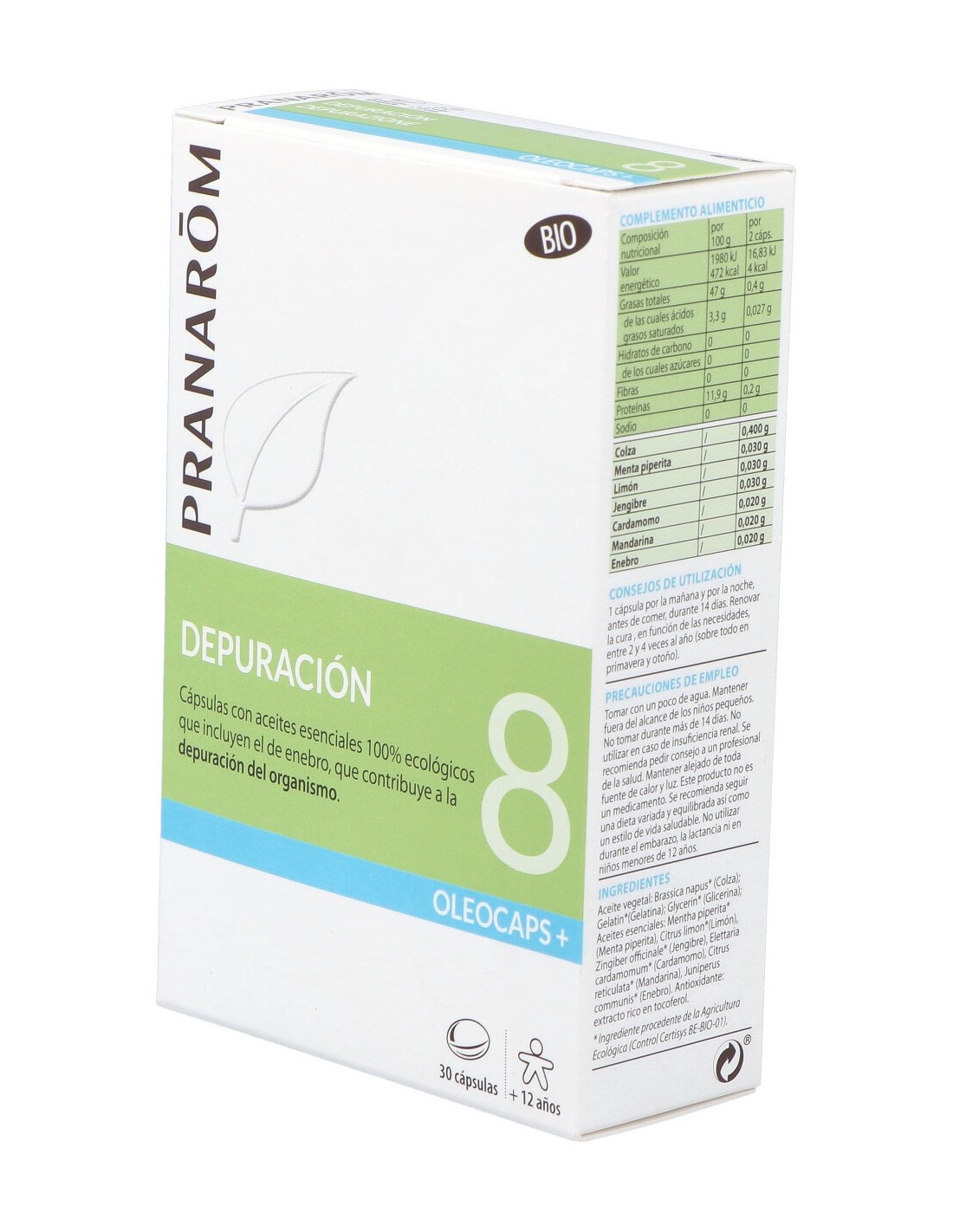 Pranarôm Oleocaps Depuración 30caps son cápsulas elaboradas con aceites esenciales 100% ecológicos. Están indicadas para personas a partir de 12 años y contribuyen a la depuración del organismo ante elementos que saturan el organismo, como el estrés, el tabaco, los medicamentos o la contaminación.