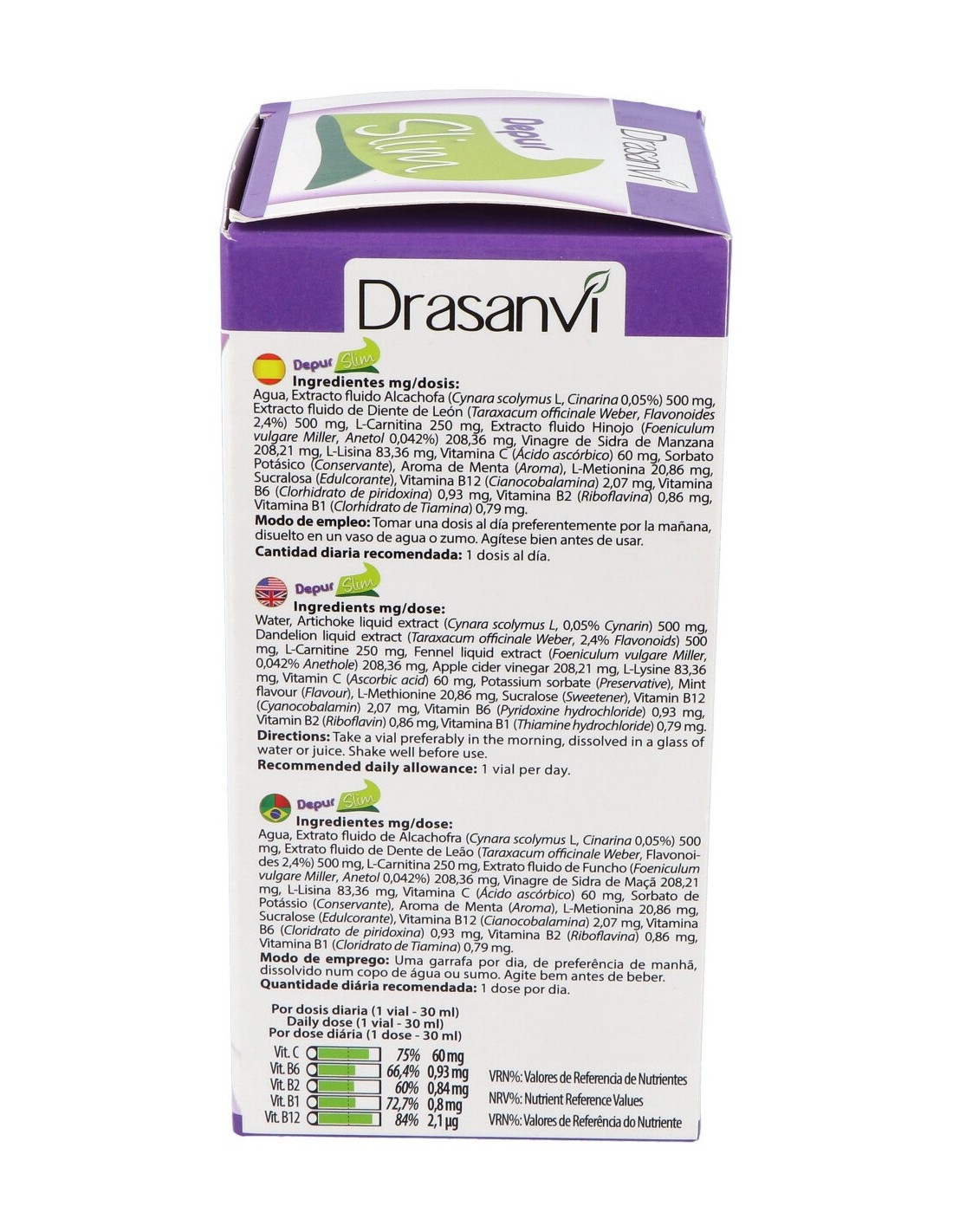 Drasanvi depur slim alcachofa de laón es un complemento alimenticio que ayuda a eliminar de forma sencilla y natural esos kilos de más. Enriquecido con cinco vitaminas elimina las toxinas y facilita la diuresis.