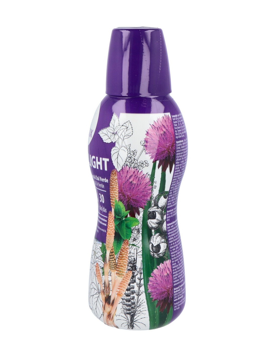 Contiene por 20 ml: Té Verde (500 mg), Cola de Caballo (367 mg), Cola (266 mg), Guaraná (233 mg), Vellosilla (233 mg), Reina de los Prados (233 mg), Ruibarbo (233 mg), Melisa (233 mg), Hinojo (233 mg), Limón (233 mg), Diente de León (233 mg), Alcachofa (233 mg), Aloe Vera (233 mg), Cardo Mariano (233 mg), Fibras (200 mg) y Colina (16,5 mg).