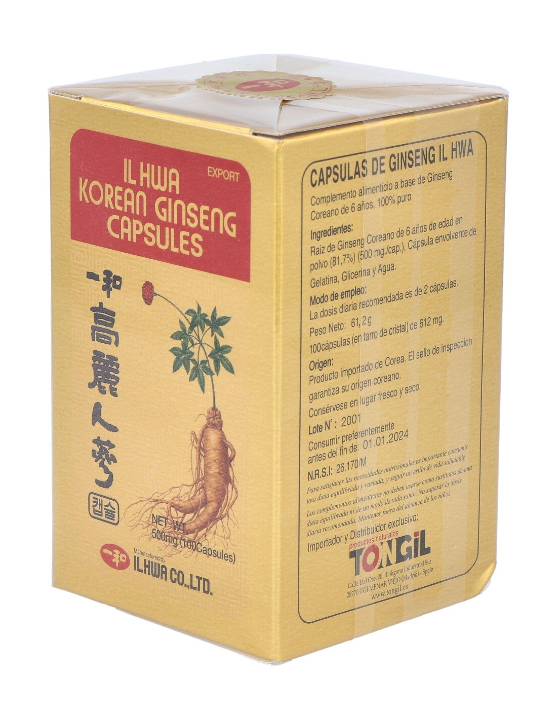 Tongil Ginseng Coreano 100caps es un complemento alimenticio a base de polvo de raíz entera de Ginseng coreano IL HWA (Panax ginseng C.A Meyer) de 6 años de edad.