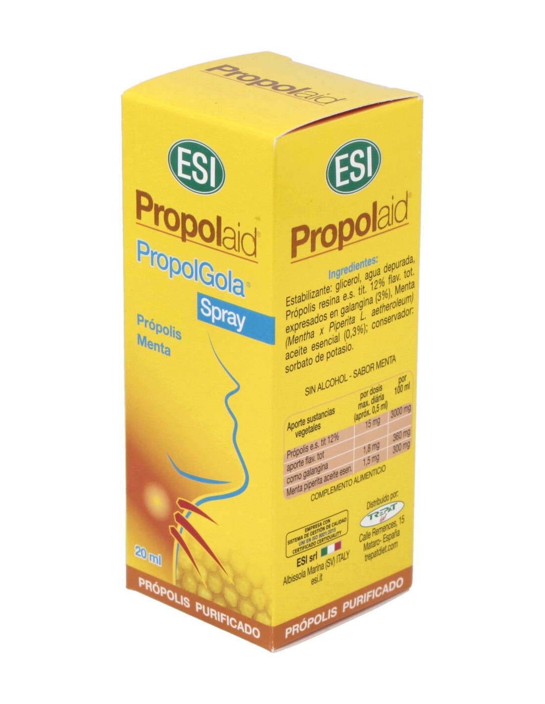 ESI Propolaid PropolGola spray menta es un eficaz tratamiento, en formato aerosol sin alcohol, a la hora de reducir la inflamación en la cavidad orofaríngea causada por los procesos catarrales, y su descenso inmunitario. Reduce la tos de forma inmediata, produciendo un alivio inmediato de los síntomas.