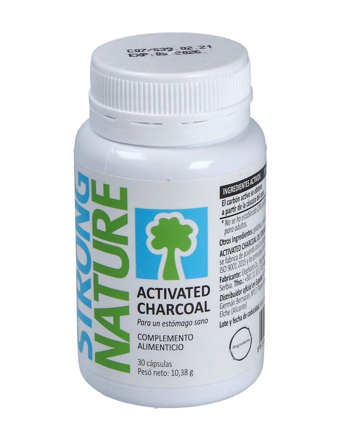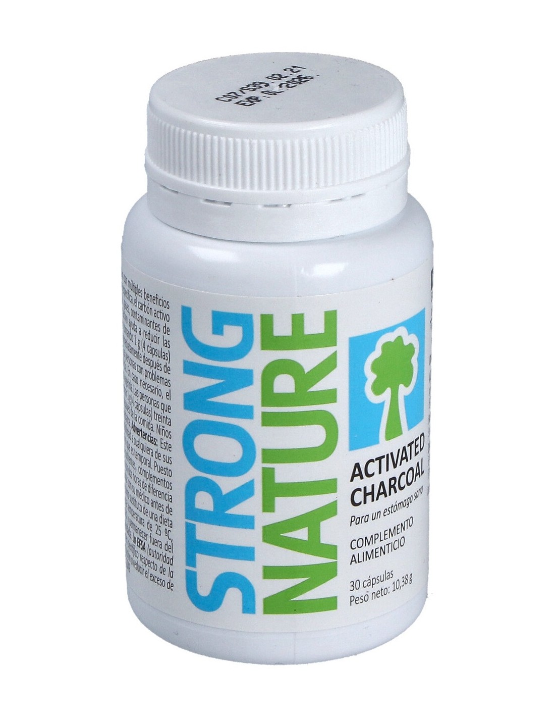 250 mg de carbón activo medicinal obtenido por carbonización de cáscara de coco.