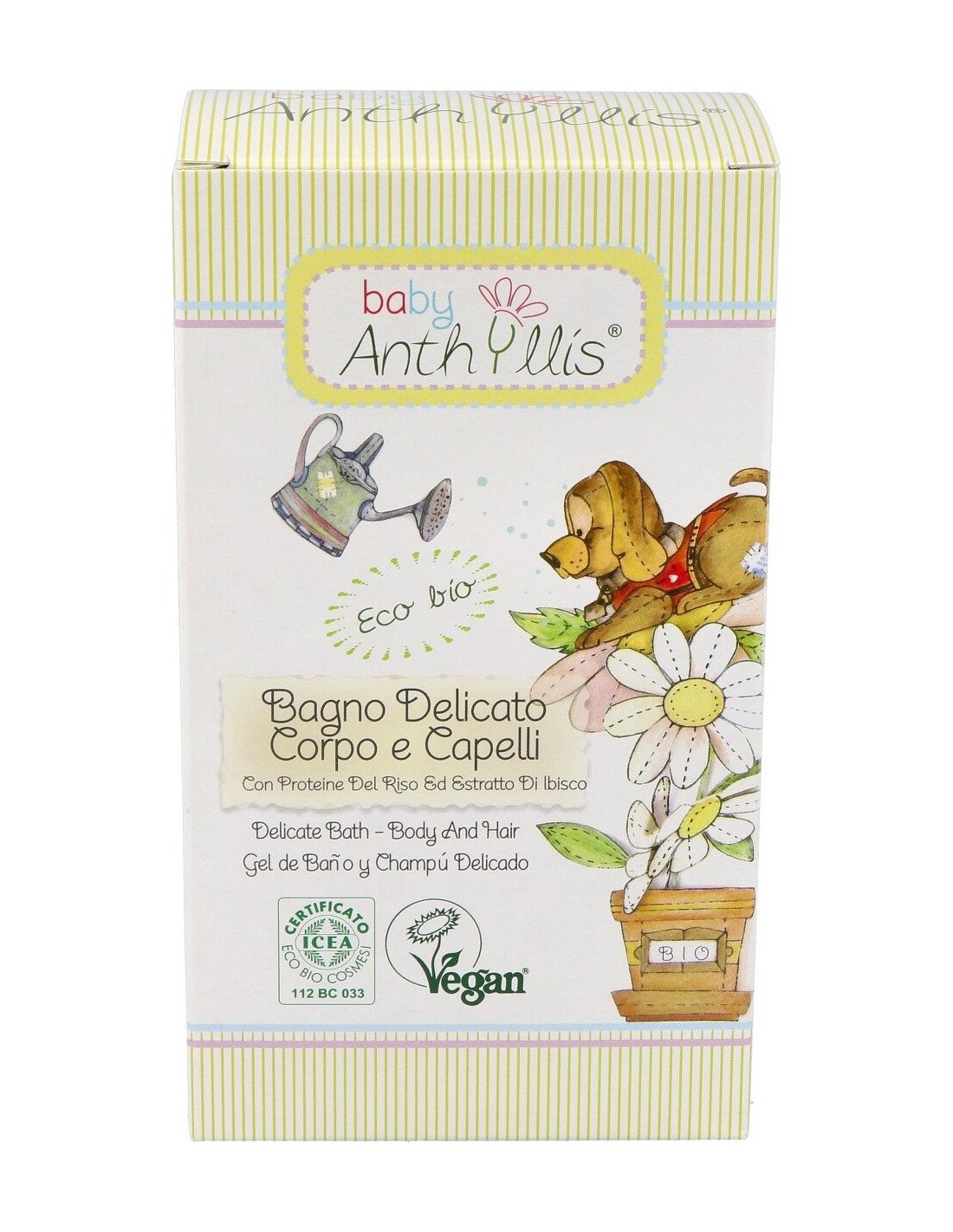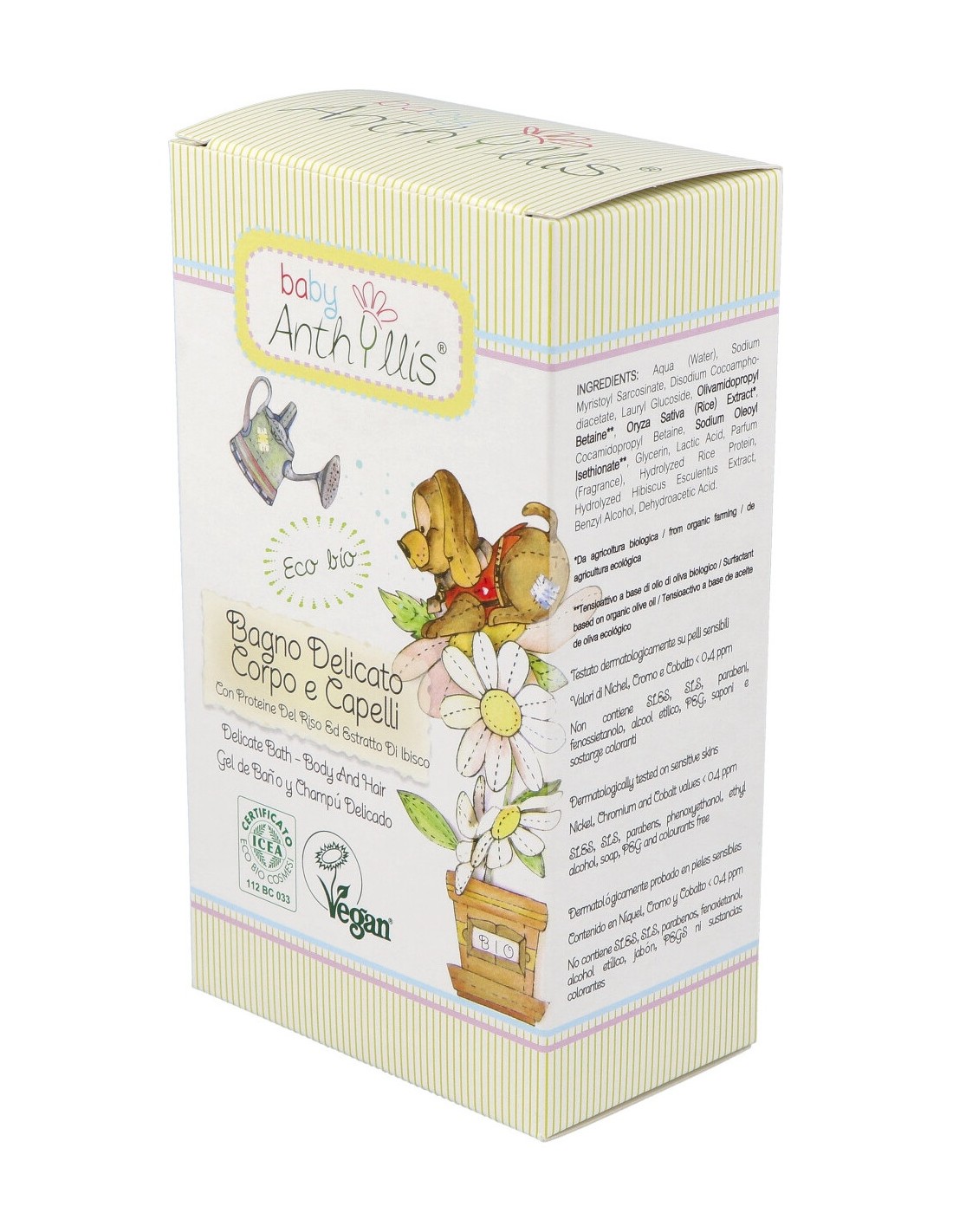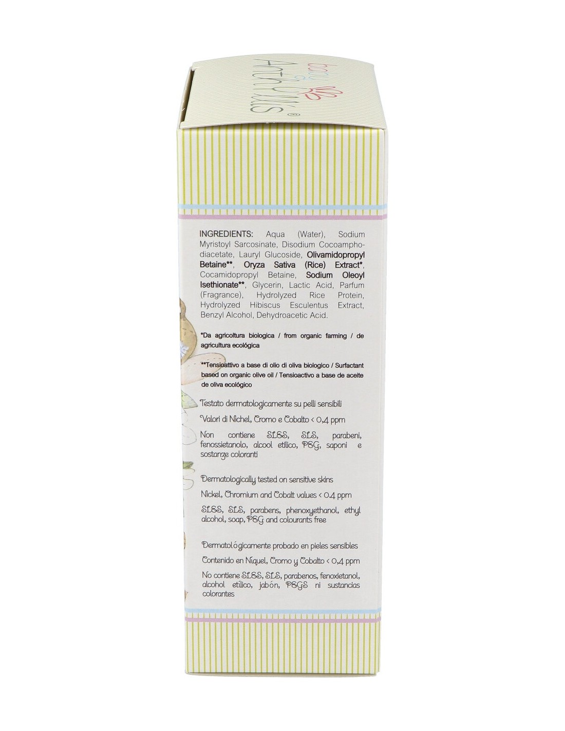 Gel específico para la higiene de la piel delicada y del cabello de los niños, a base de tensioactivos especialmente suaves, obtenidos de aceite de Oliva de agricultura ecológica. Fórmula enriquecida con proteínas de Arroz y extracto de Hibisco.Características: No contiene SLES, ni SLS en los tensioactivos. No contiene jabón, ni sustancias colorantes. pH 6,5, fisiológico para la piel del niño. Testado dermatológicamente en pieles sensibles. Controlado su contenido en Níquel, Cromo y Cobalto.