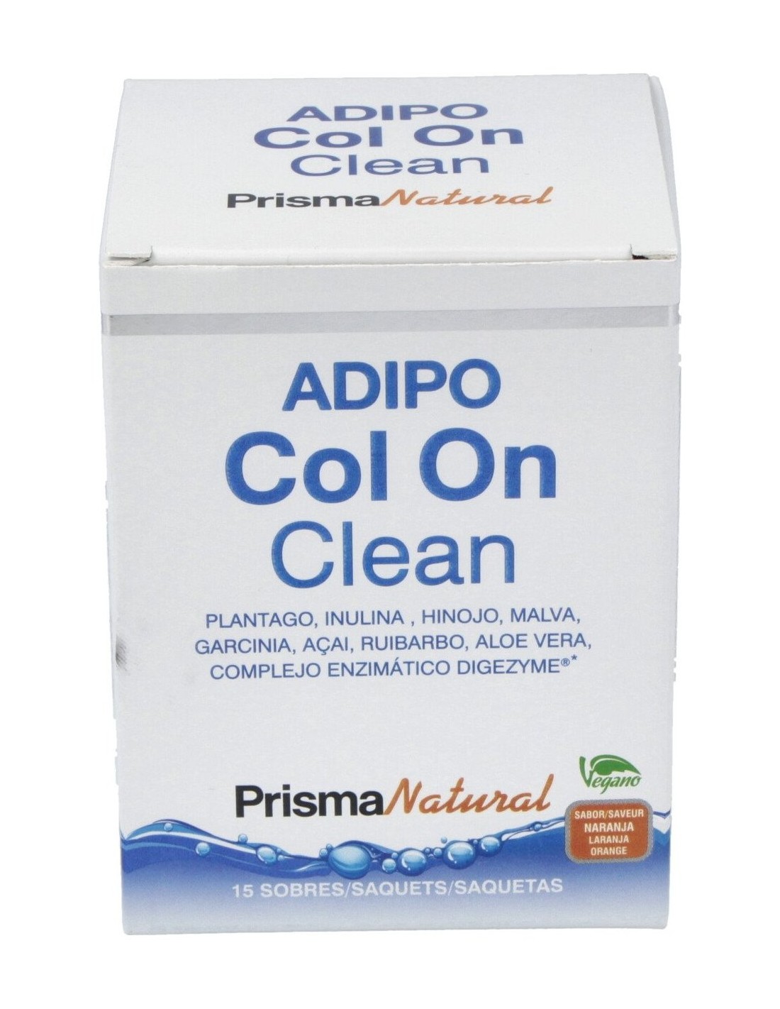 Plantago (plantago ovata forssk) 4 g, inulina 1,5 g, hinojo (foeniculum vulgare mill.) 450 mg, malva (malva sylvestris l.) 200 mg, tamarindo (garcinia cambogia desr.) 200 mg, acai (euterpe oleracea c. martius) 100 mg, ruibarbo (rheum officinale baill.) 50 mg, complejo enzimático digezyme® (proteasa, lipasa, celulasa y lactasa) 25 mg, aloe (aloe vera (l.) burm. f.) 10 mg, aroma (aroma de naranja), edulcornate (sucralosa) y colorante (beta-caroteno).