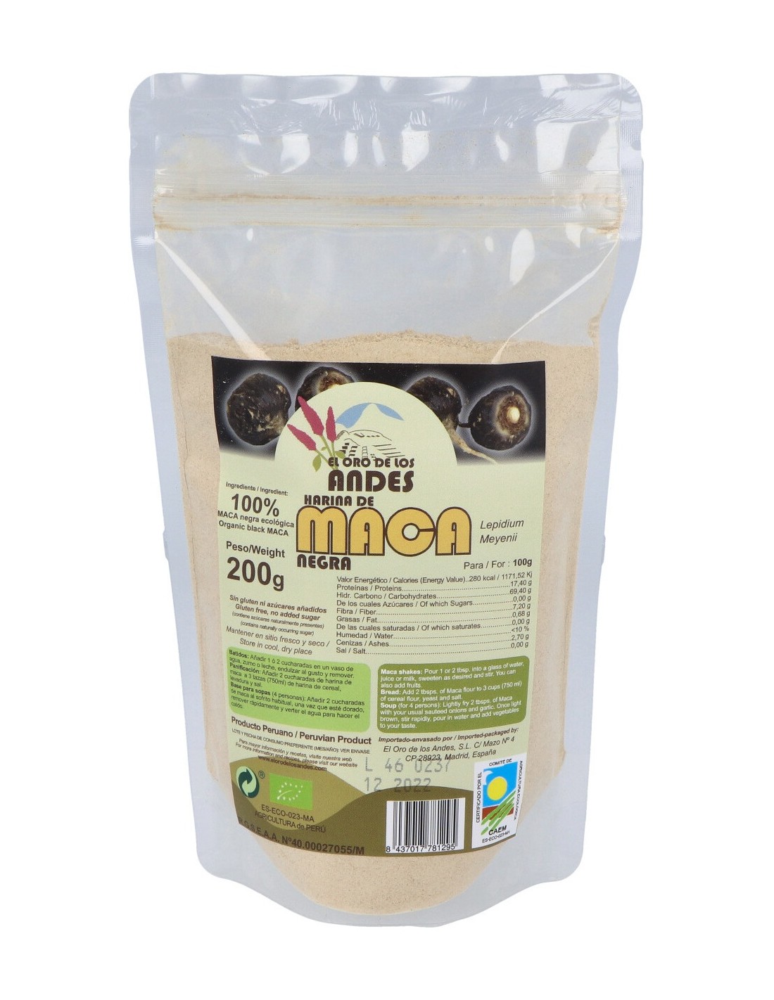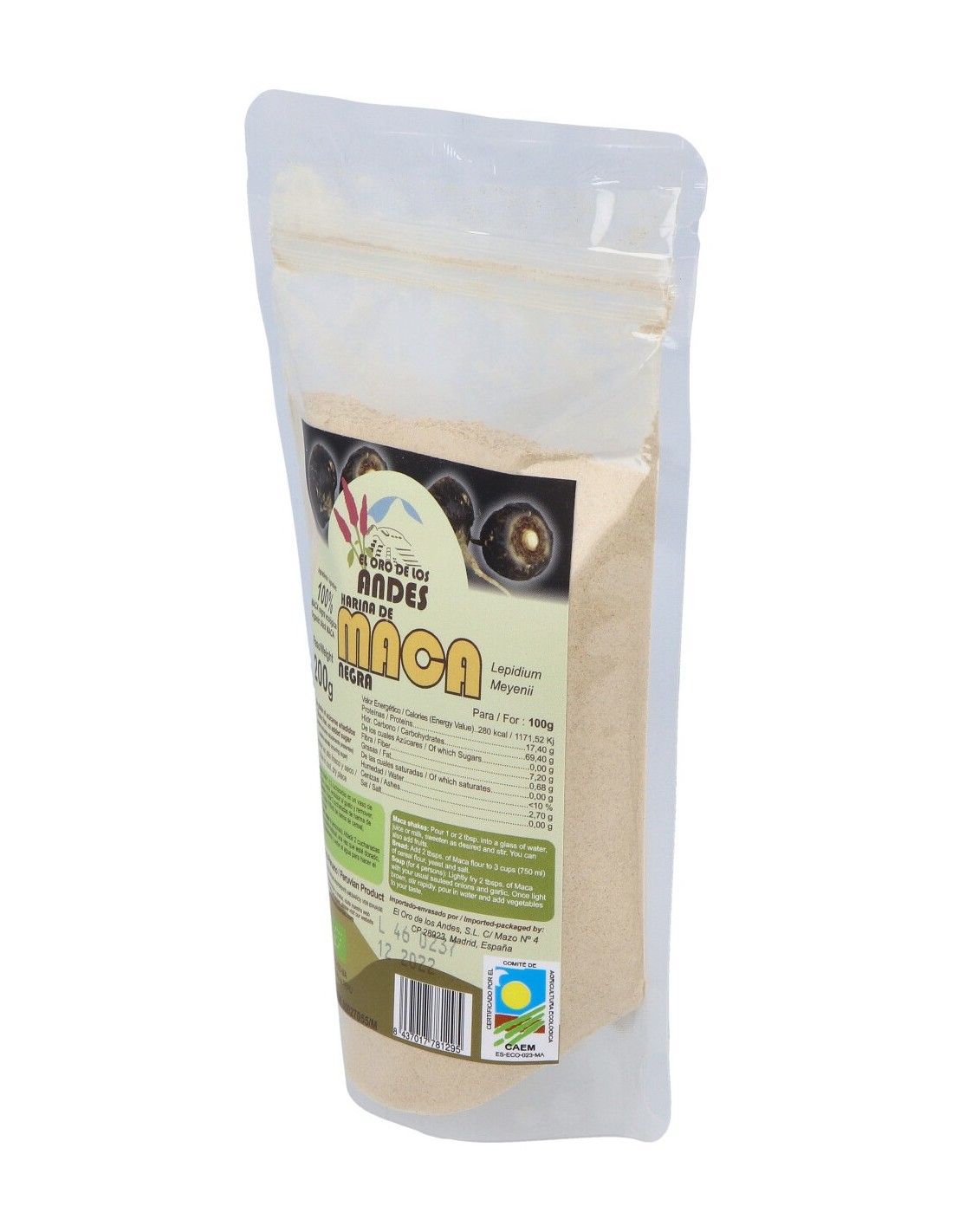 Complemento alimenticio en forma de polvos, elaborado a base de maca negra 100% pura y ecológica, que tiene propiedades energéticas y estimulantes, y que es ideal para su uso en casos de necesidad de un aporte extra de energía. Ideal para la realización de batidos, o para incluir en la elaboración de panes o sopas.
