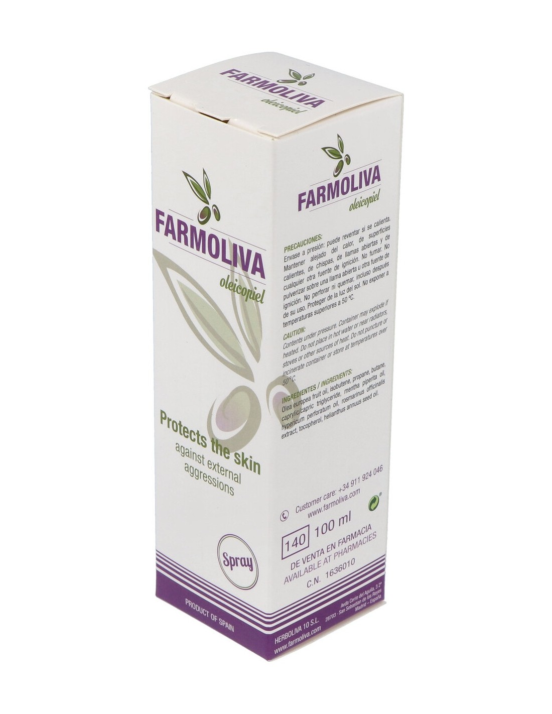 Para aplicar el producto agite previamente el envase antes de usarlo. Farmaoliva Oleicopiel se aplica fácilmente no siendo necesario tocar la piel afectada. Pulverice a una distancia de 20cm aproximadamente pulsando sobre la válvula especial que extiende el producto homogéneamente. Esto evita extender el producto manualmente lo que facilita la labor del enfermero y proporciona un mayor bienestar al enfermo.