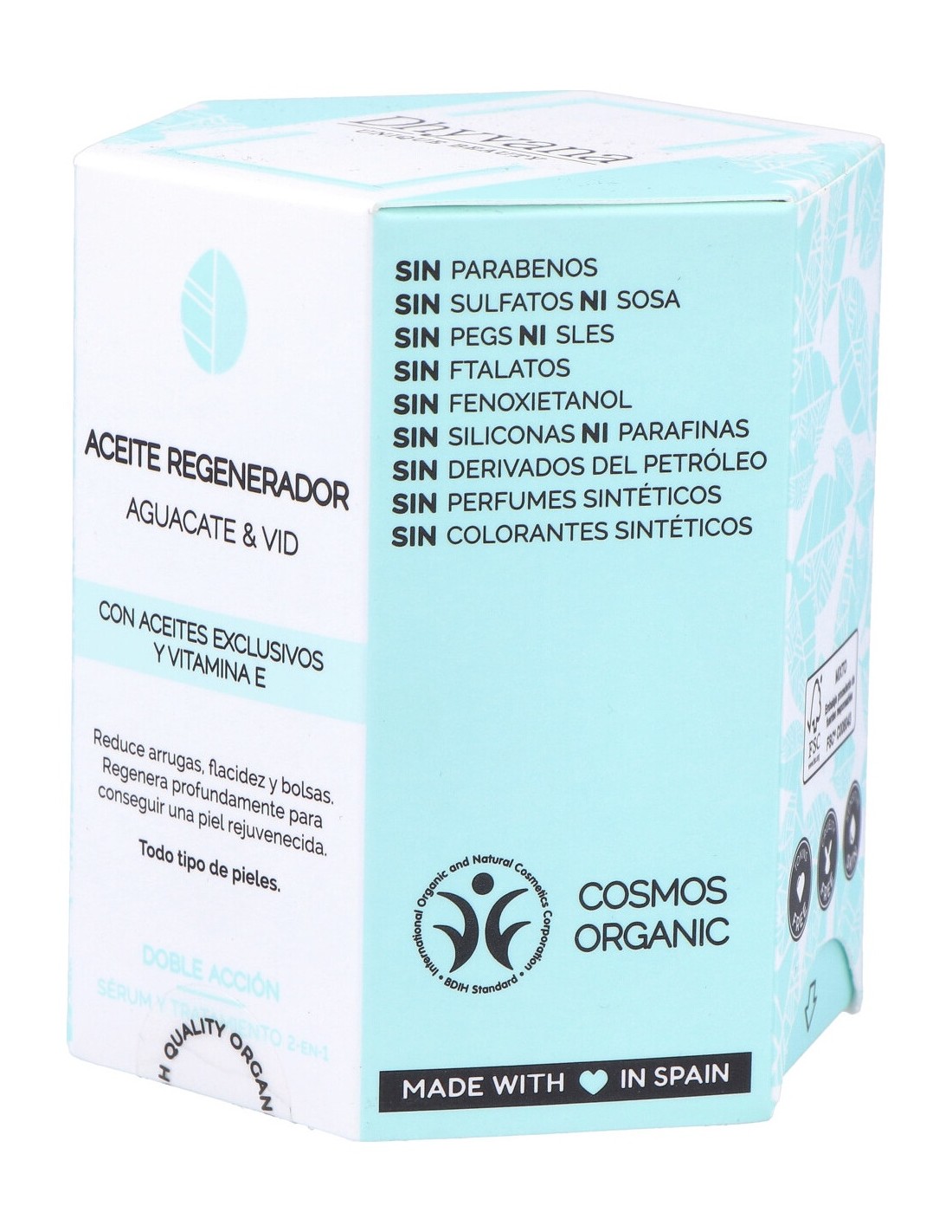 La perfecta unión del aguacate y la vid junto con el extracto añadido de Vitamina E, convierten a este aceite facial en un elixir antienvejecimiento, que regenera profundamente la piel, reduciendo las arrugas y las bolsas, al mismo tiempo que previene la flacidez de la piel. Ademñas es apto para pieles sensibles.