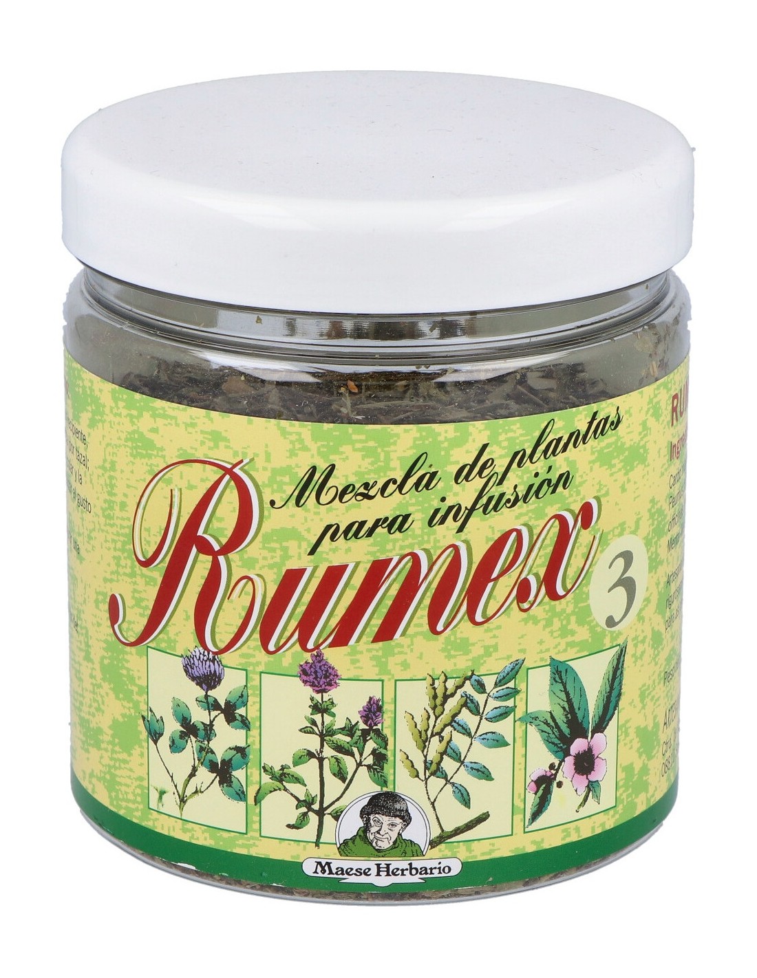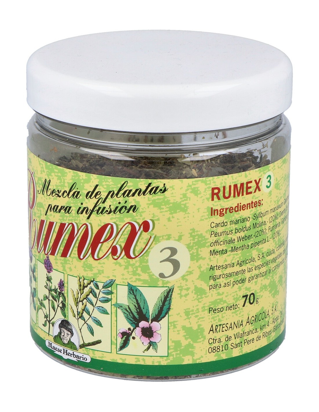 Fumaria (Fumaria officinalis) 35%, Boldo (Peumus boldus) 20%, Diente de león (Taraxacum officinale) 20%, Menta (Mentha piperita) 15%, Manzanilla amarga (Santolina chamaecyparisus) 10%, Ajenjo (Artemisia absinthium) 10%.