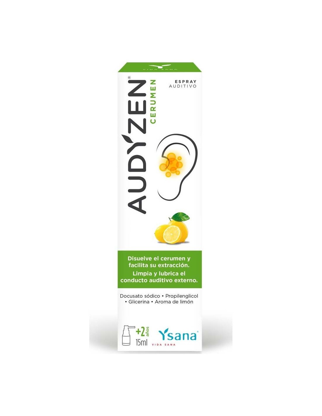 Spray auditivo con docusato sódico, propilenglicol, glicerina y aroma de limón. Está indicado para suavizar y disolver la acumulación de cerumen y facilitar su extracción. Al mismo tiempo limpia y lubrica el conducto auditivo externo, ayudando a evitar la acumulación de cerumen. Apto a partir de 2 años. Apto para veganos.