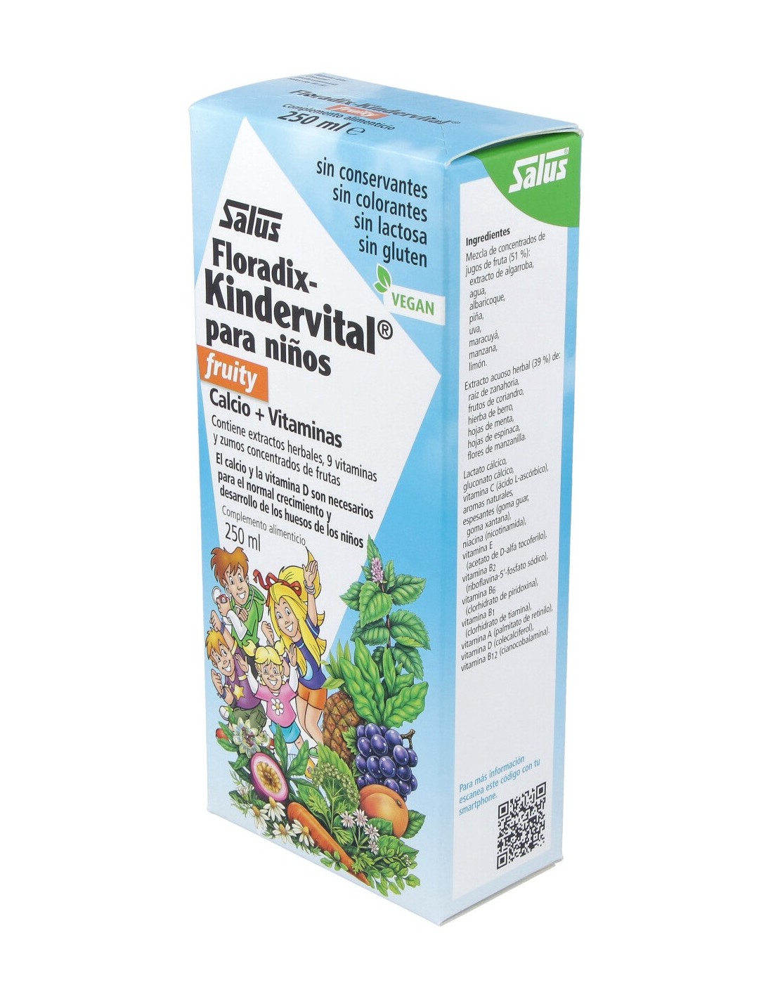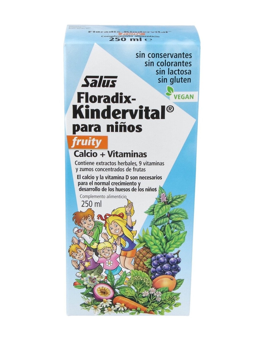 Floradix Kindervital® Fruity es un jarabe fórmulado especialmente para los niños que aporta las cantidades necesarias de calcio y vitamina D para garantizar un correcto desarrollo de los huesos.