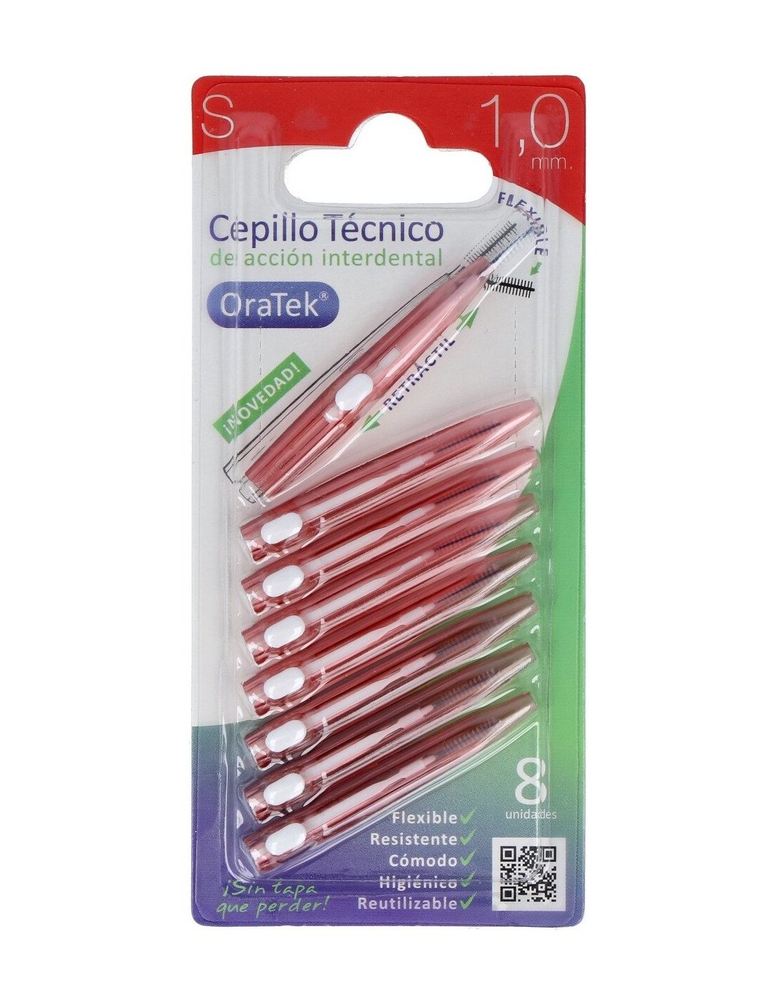 El cepillo aparece al accionar un cómodo botón deslizante al ser empujado hacia arriba desde el mango, y después de su uso se retrae hacia abajo para meterse de nuevo y mantenerse limpio y protegido. Se puede guardar en el bolsillo tras su uso sin estar pendiente de una segunda pieza. Gracias a la calidad de sus materiales, con un uso adecuado y un correcto mantenimiento, puede ser reutilizado varias veces.CEPILLO INTERDENTAL RETRACTIL 1mm 8ud. de ORATEK