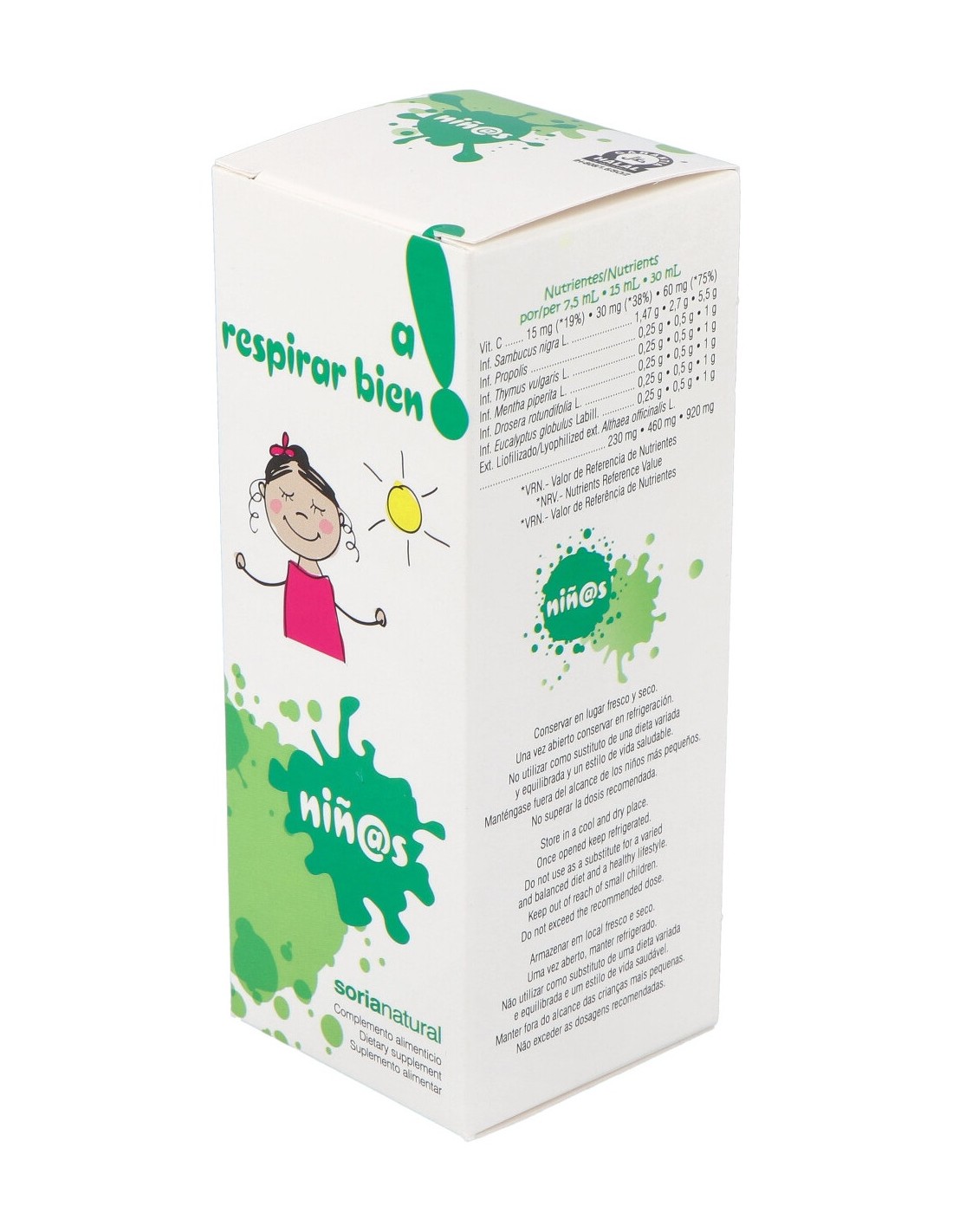 Complemento alimenticio formulado para niños con la finalidad de ayudar al óptimo funcionamiento del sistema respiratorio, ante la agresión de los factores ambientales. Elaborado con ingredientes naturales, plantas y concentrados de frutas que ayuda al mantenimiento de la salud del tracto respiratorio. Idóneo para tratar resfriados comunes o catarros, gripes, tos seca e improductiva, entre otros. Indicado para niños entre 4 a 12 años.