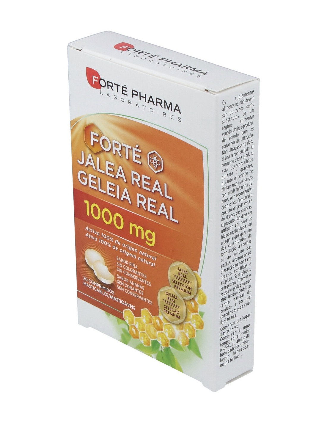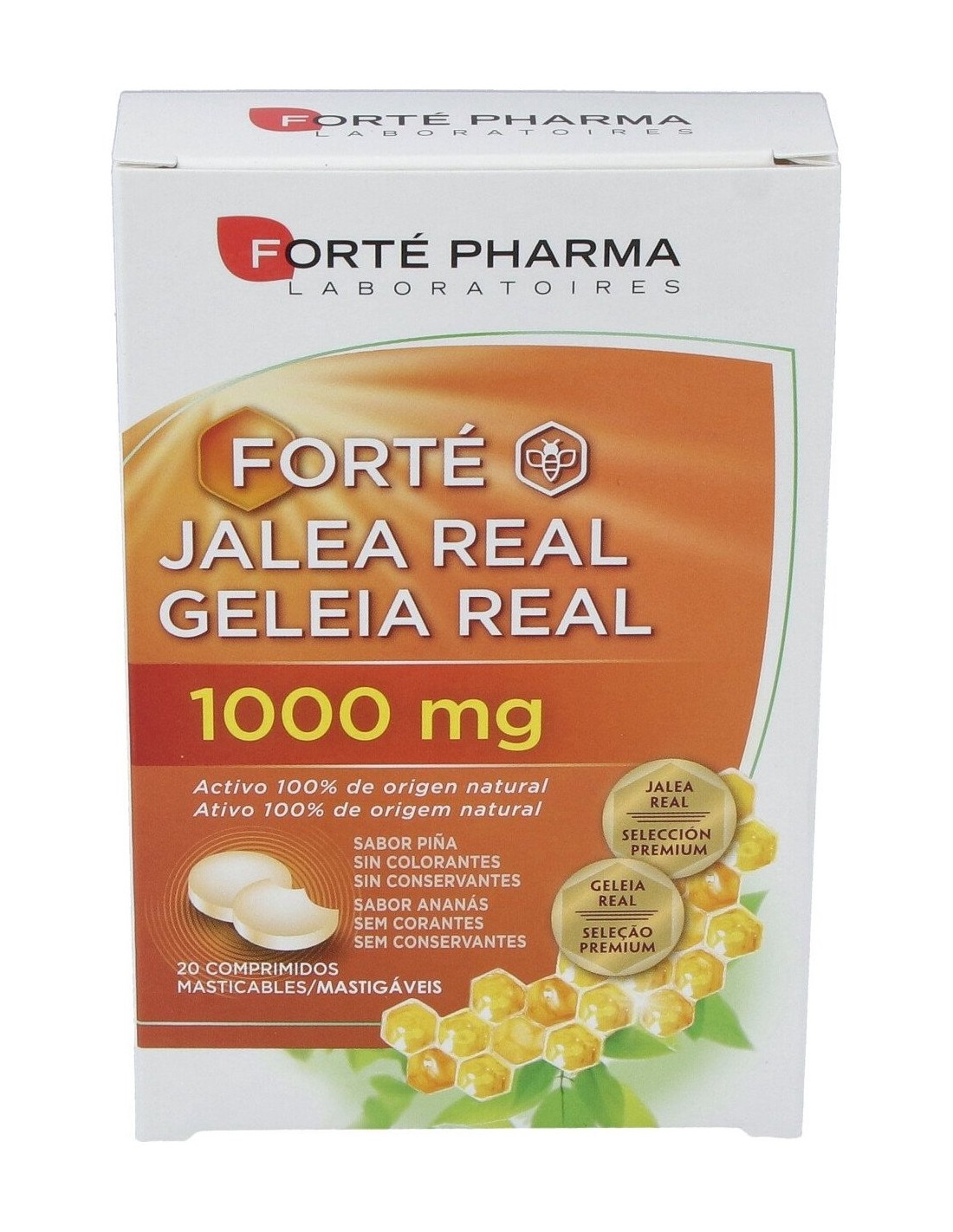 INGREDIENTESPor comprimido: edulcorantes (sorbitol, xilitol, sucralosa), jalea real liofilizada (333 mg) equivalente a 1000 mg de jalea real fresca, acidificantes (ácido málico), antiaglomerantes (dióxido de silicio, sales de magnesio de ácidos grasos), aroma piña.