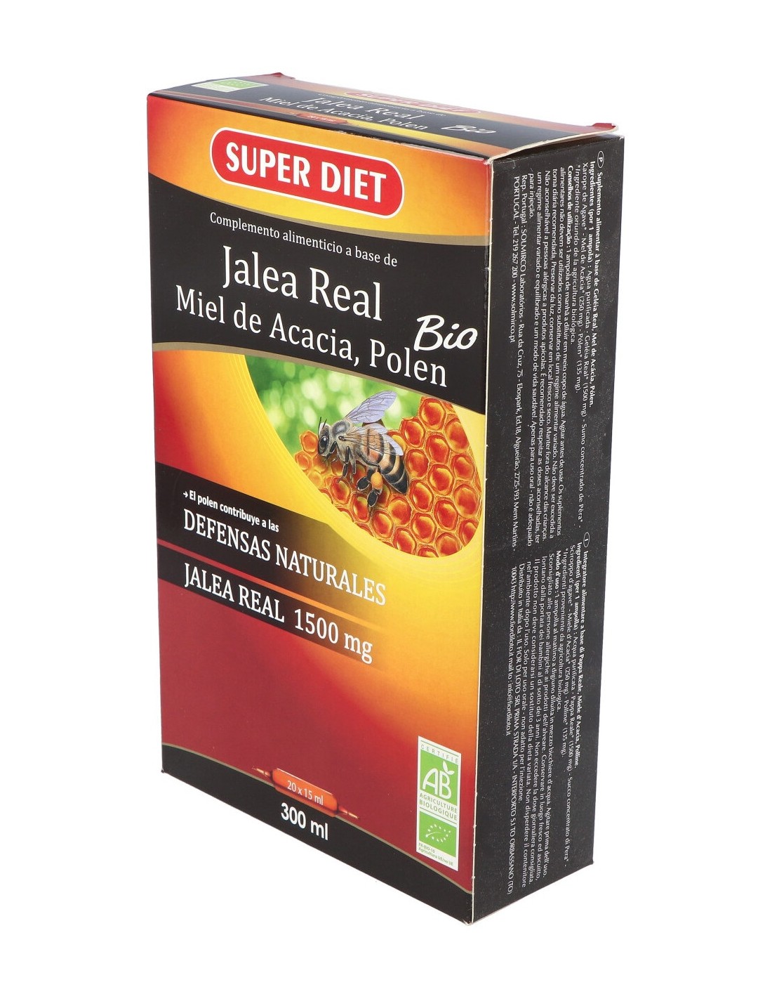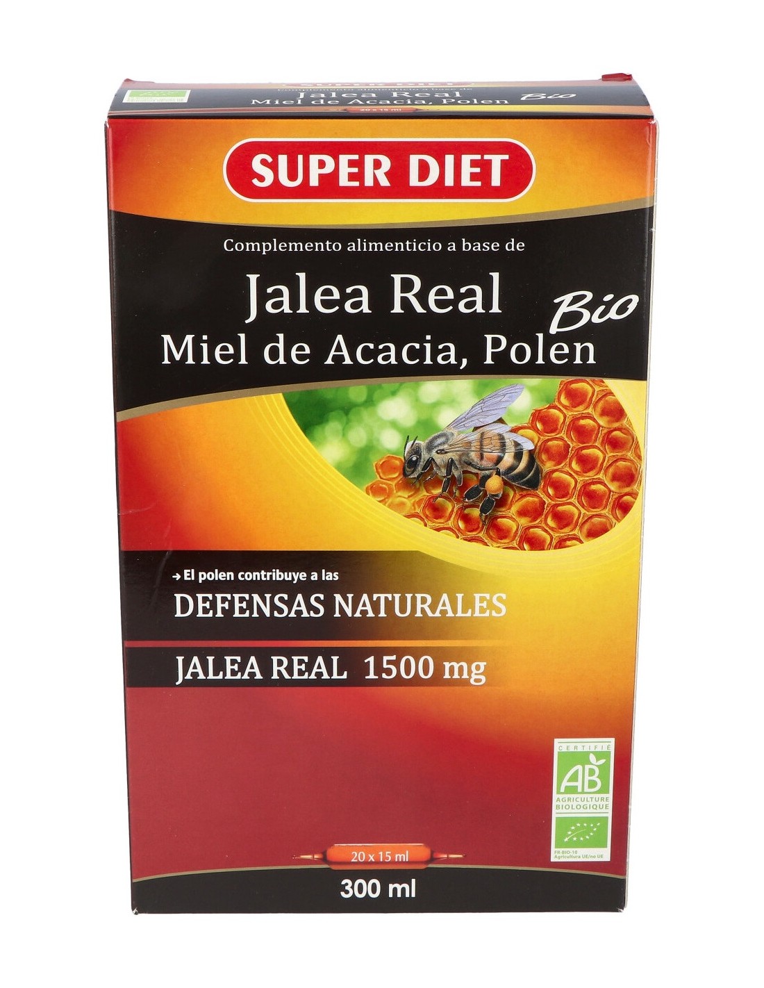 Complemento alimenticio formulado a base de jalea real, miel obtenida del néctar de la acacia y polen bio. Textura gruesa y sabor dulce. Presentación de 20 ampollas bebibles. Contribuye al normal mantenimiento de las defensas naturales del organismo. Sus ingredientes tienen propiedades beneficiosas para el sistema inmune. Indicado para ingesta en estados de fatiga o decaimiento.