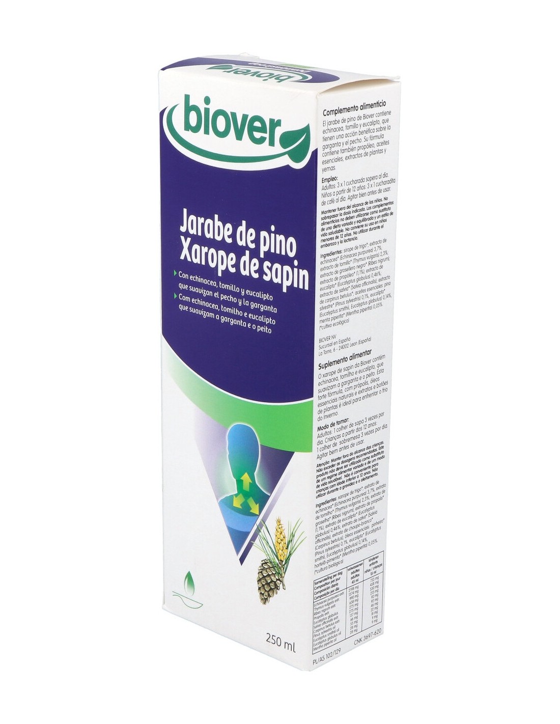 Complemento alimenticio que ayuda a proporcionar una acción benéfica sobre la garganta y el pecho. El jarabe de pino está elaborado a base de echinacea, tomillo y eucalipto, además de propóleo, aceites esenciales, extractos de plantas y yemas. Es ideal para tomar en los días fríos de invierno. No contiene azúcar, y no está recomendado para mujeres embarazadas.