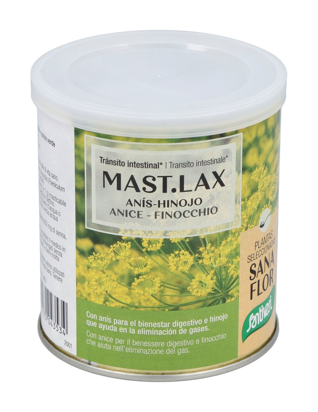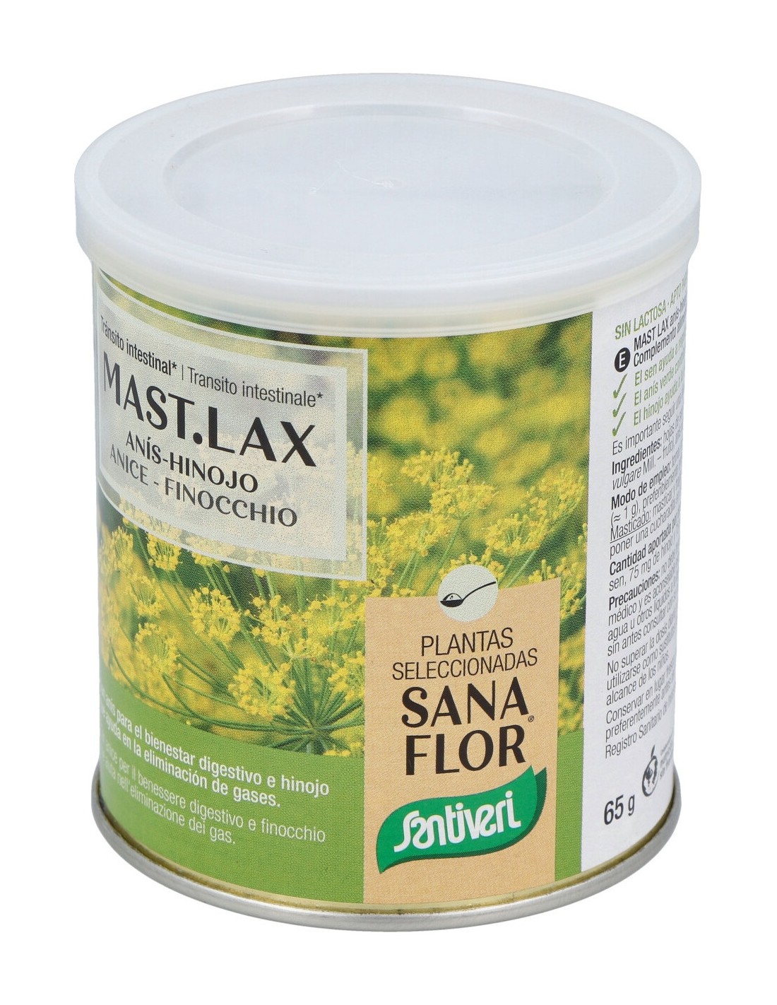 Santiveri Sanaflor Bote Mast-Lax Gases 65gr es un complemento alimenticio diseñado para estimular el tránsito intestinal y proteger la flora bacteriana.