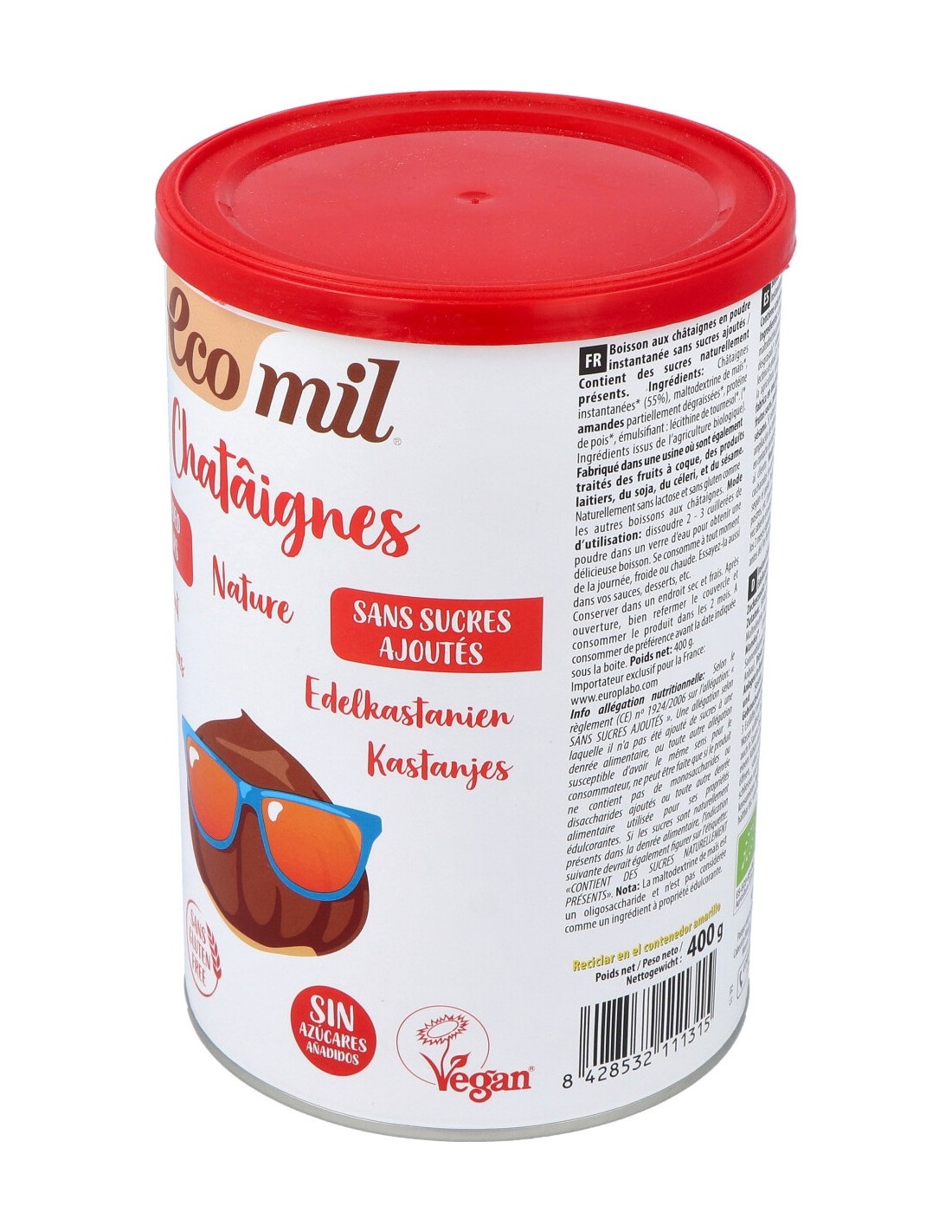 Ecomil Bebida Ecológica De Castaña Instantánea 400g es una bebida vegetal de castaña perfecta para sustituir a las leches de origen animal sobre todo en una alimentación vegana o vegetariana. Es una bebida instantánea para mezclar con agua que está elaborada con castañas españolas y ecológicas, por lo que su elaboración es respetuosa con el medio ambiente.