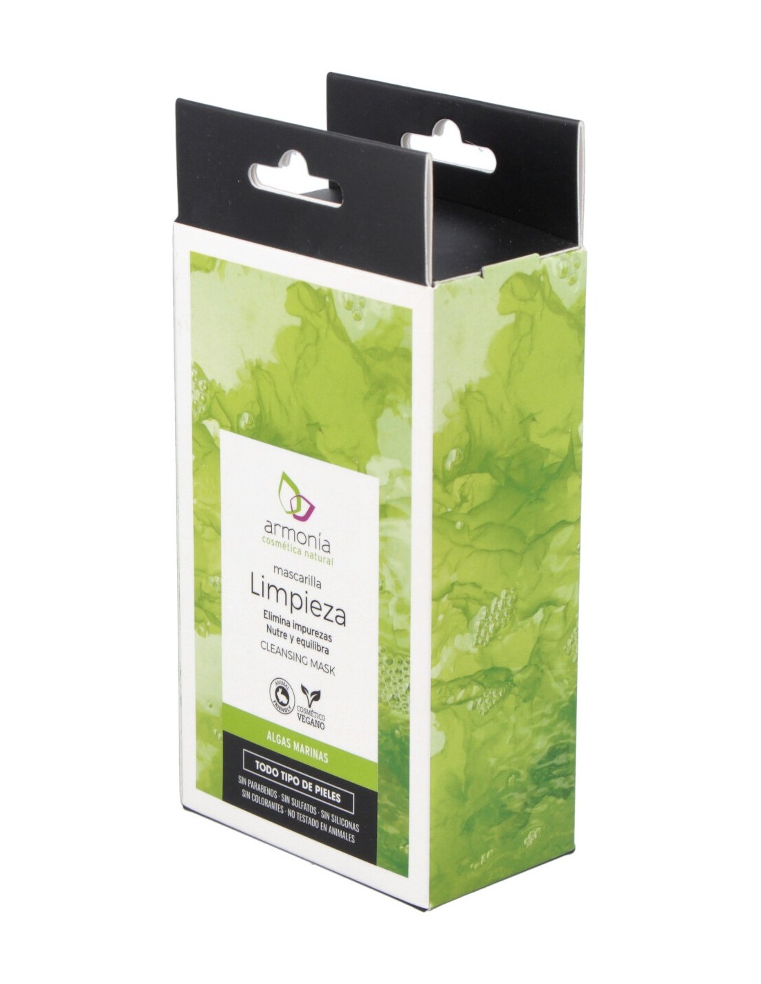 Mascarilla facial a base de algas de alta concentración de oligoelementos y sales minerales, además de vitaminas y provitaminas A y D. La abundancia de sales minerales hace del fucus un alga remineralizante, que devuelve el equilibrio a la piel. Su efecto se une al poder absorbente de la arcilla que elimina las impurezas y arrastra la suciedad de los poros.MASCARILLA FACIAL DE ALGAS 12sbrs. de ARMONIA Cosmetica Natural