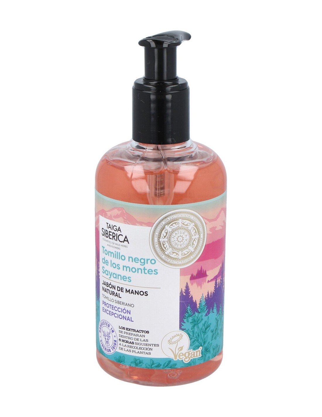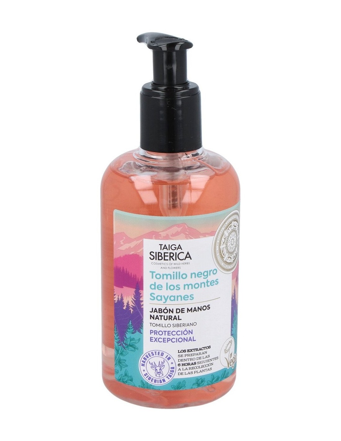 Jabón de manos con serpol negro de los montes Sayanes y una combinación de extractos de plantas de la taiga que ayuda a limpiar la piel de las manos de forma especialmente cuidadosa y eficaz mientras le otorga una protección duradera. No contiene: Parabenos, PEG, Siliconas, Fragancias Sintéticas, Tintes Sintéticos, ni Aceites Minerales. Vegano.