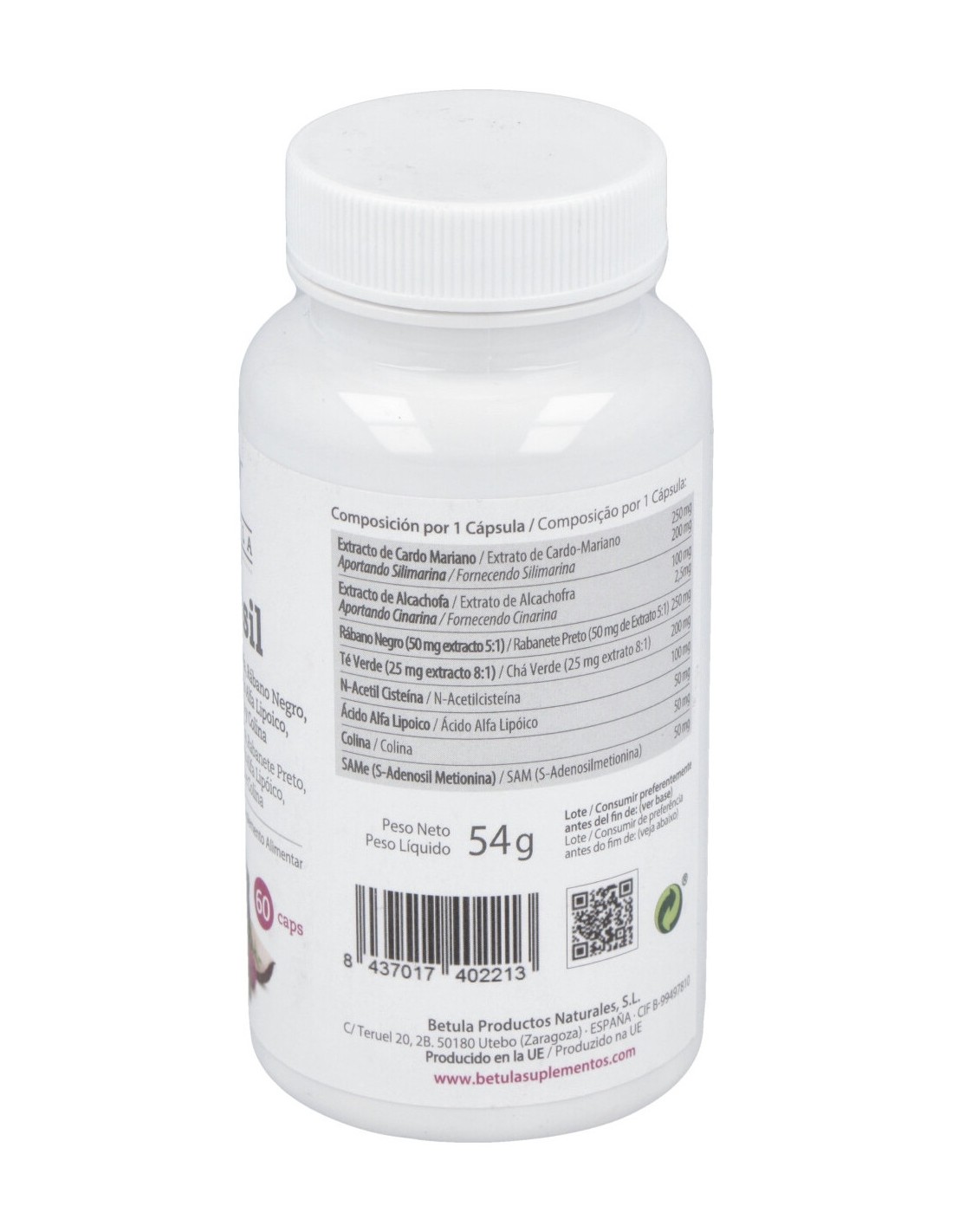 Extracto de Cardo Mariano (Silybum marianum), Citrato de Colina, Agente de Recubrimiento (Hidroxipropil Metilcelulosa), Extracto de Alcachofa (Cynara scolymus), N-Acetil Cisteína, Extracto de Rábano Negro (Raphanus sativus), Ácido Alfa Lipoico, S-Adenosil-L-Metionina, Extracto de Té Verde (Camellia sinensis), Agente de Carga (Celulosa Microcristalina), Antiaglomerante (Estearato de Magnesio).