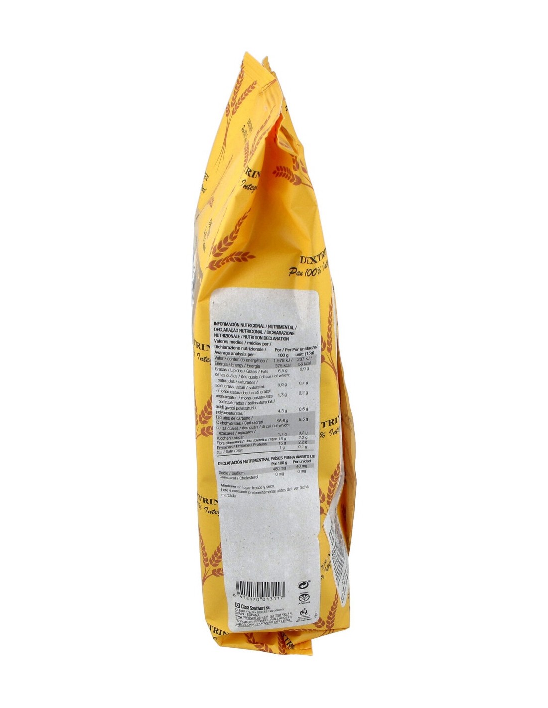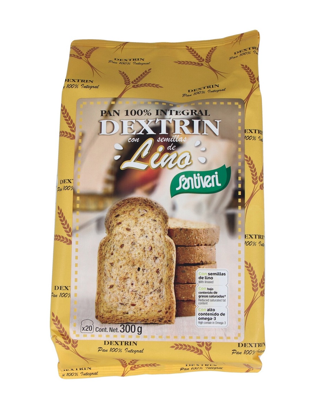 Harina de trigo integral (80%), semillas de lino (9,1%), levadura madre (19%), aceite de oliva virgen extra, sal, extracto de malta de cebada, extracto rico en tocoferoles (antioxidante), vitamina B9 (ácido pteroilmonoglutámico)