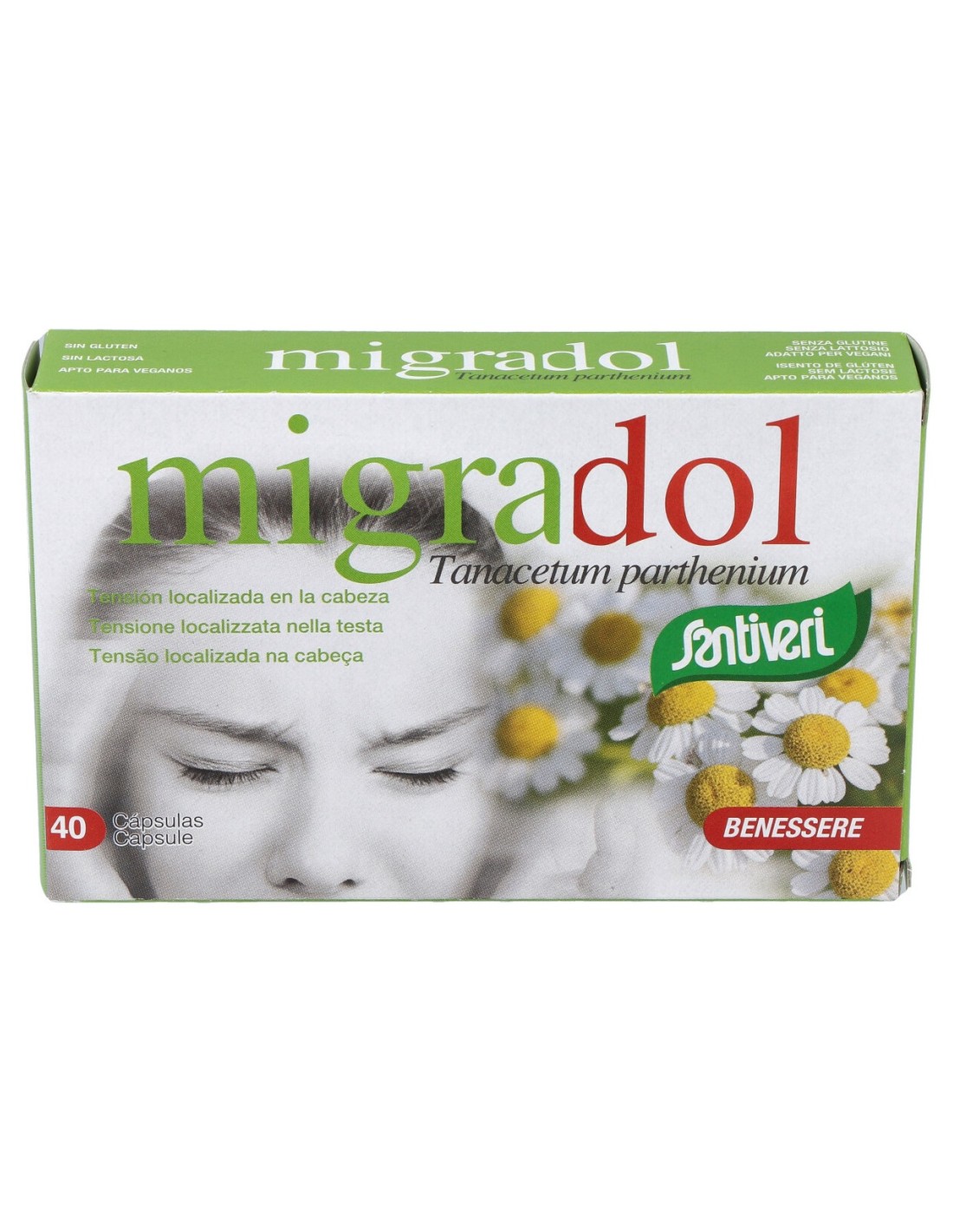 Elaborado principalmente a base de matricaria, una planta para variados usos medicinales. Esta planta te ayuda a curar los dolores de cabeza y las migrañas. Sus propiedades analgésicas actúan sobre los focos de tensión, alivian el dolor y el malestar y mejoran la calidad de vida de la persona que sufre estos episodios, que a veces resultan casi insoportables. La matricaria, o Tanacetum parthenium, es una flor muy semejante a la manzanilla, originaria de Grecia y los países balcánicos. Ya los griegos la usaban para mitigar los dolores, vértigos, inflamaciones o picaduras de insectos. Santiveri contribuye también a disminuir los dolores musculares y los síntomas febriles. Debe consumirse de forma regular, ya que se trata sobre todo de un tratamiento preventivo. Se recomienda tomarla como mínimo de 4 a 6 semanas para notar sus efectos.