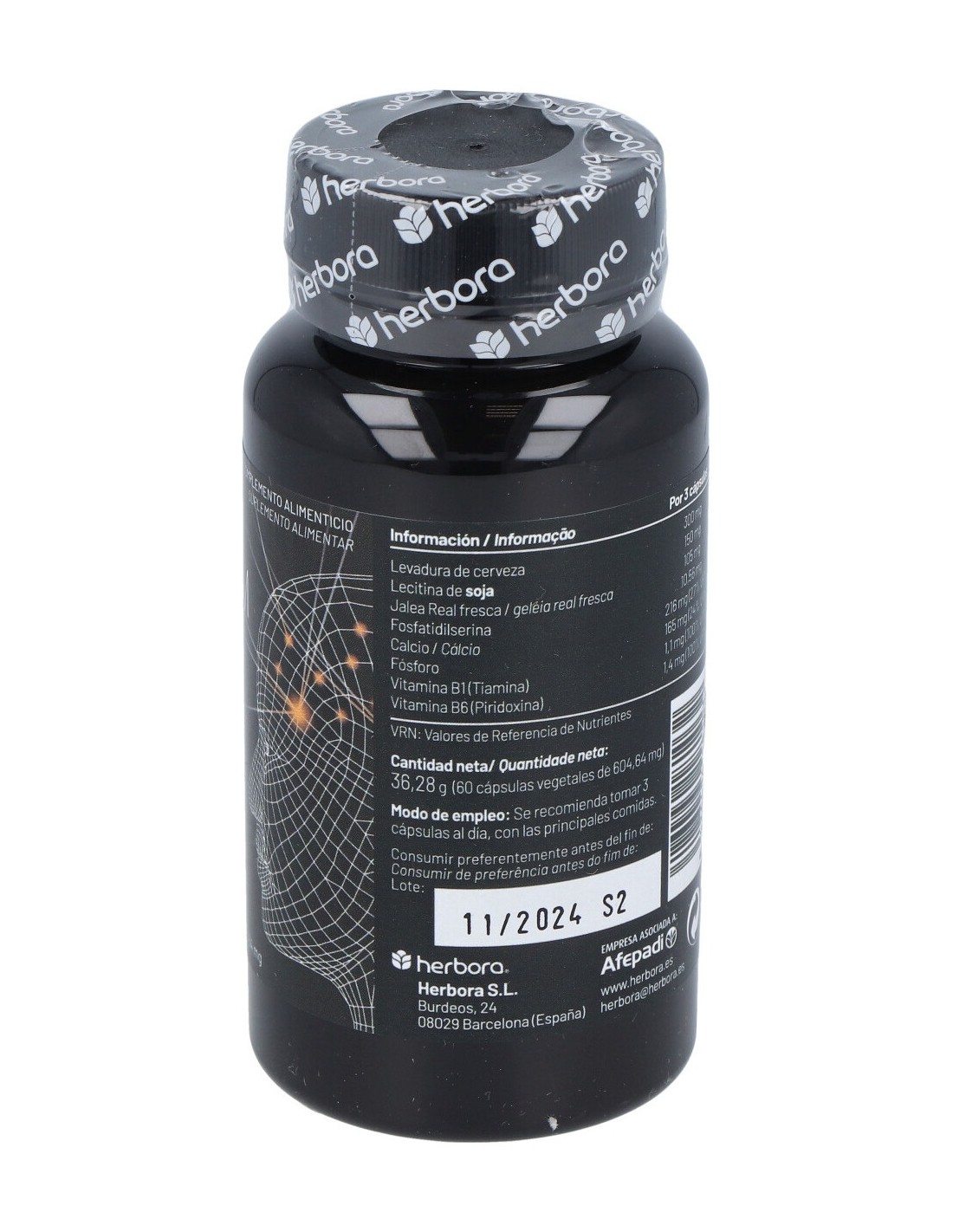 Por 3 cápsulas: Levadura de cerveza (sin gluten) 300 mg, lecitina de soja 150 mg, jalea real fresca 105 mg, fosfatidilserina 10,56 mg, calcio 216 mg (27% VRN), fósforo 165 mg (24% VRN), vitamina B1 (Tiamina) 1,1 mg (100% VRN), vitamina B6 (Piridoxina) 1,4 mg (100% VRN). VRN: Valor de Referencia de Nutrientes. Otros ingredientes: fosfato dicálcico, celulosa microcristalina (antiaglomerante) y estearato de magnesio vegetal (antiaglomerante).