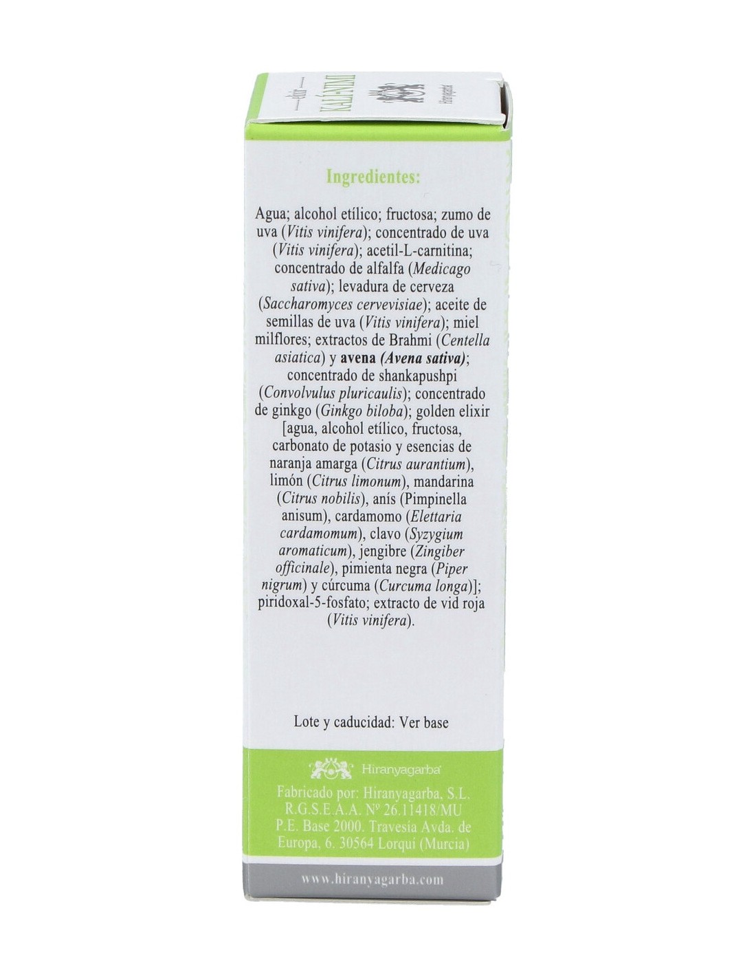 Agua: alcohol etílico: fructosa: zumo de uva (Vitis vinifera): concentrado de uva (Vitis vinifera): acetil-L-carnitina: concentrado de alfalfa (Medicago sativa): levadura de cerveza (Saccharomyces cervevisiae): aceite de semillas de uva (Vitis vinifera): miel milflores: extractos de Brahmi (Centella asiatica) y avena (Avena sativa): concentrado de shankapushpi (Convolvulus pluricaulis): concentrado de ginkgo (Ginkgo biloba): golden elixir [agua, alcohol etílico, fructosa, carbonato de potasio y esencias de naranja amarga (Citrus aurantium), limón (Citrus limonum), mandarina (Citrus nobilis), anís (Pimpinella anisum), cardamomo (Elettaria cardamomum), clavo (Syzygium aromaticum), jengibre (Zingiber officinale), pimienta negra (Piper nigrum) y cúrcuma (Curcuma longa)]: piridoxal-5-fosfato: extracto de vid roja (Vitis vinifera).