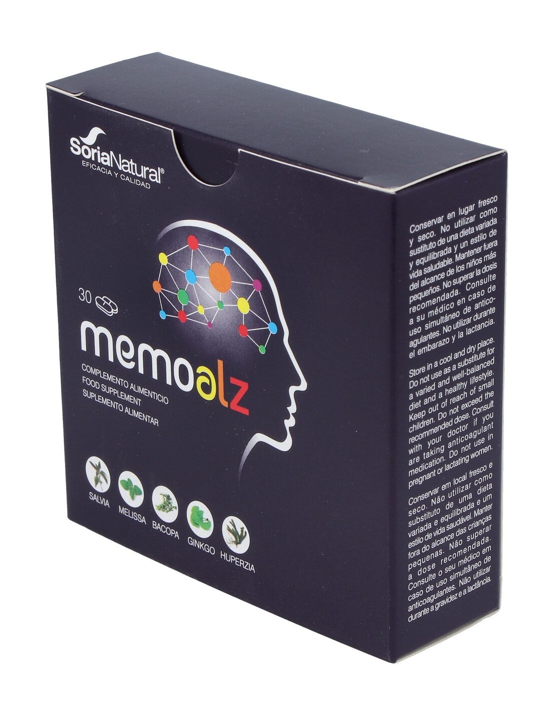 Complemento alimenticio con Bacopa y Huperzia. Bacopa ayuda al mantenimiento de una buena función cognitiva. Huperzia mejora el funcionamiento mental general.MEMOALZ 30comp. de SORIA NATURAL