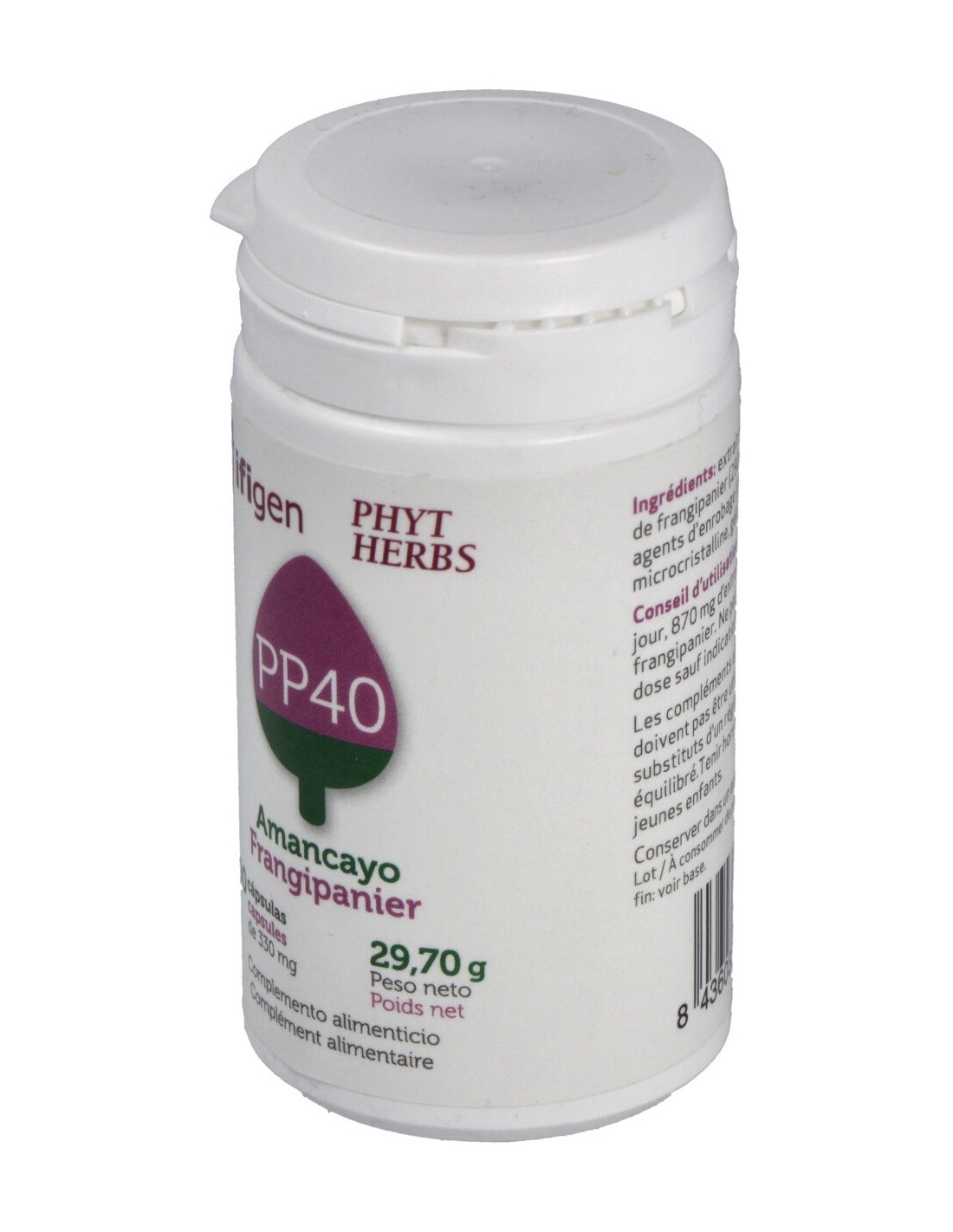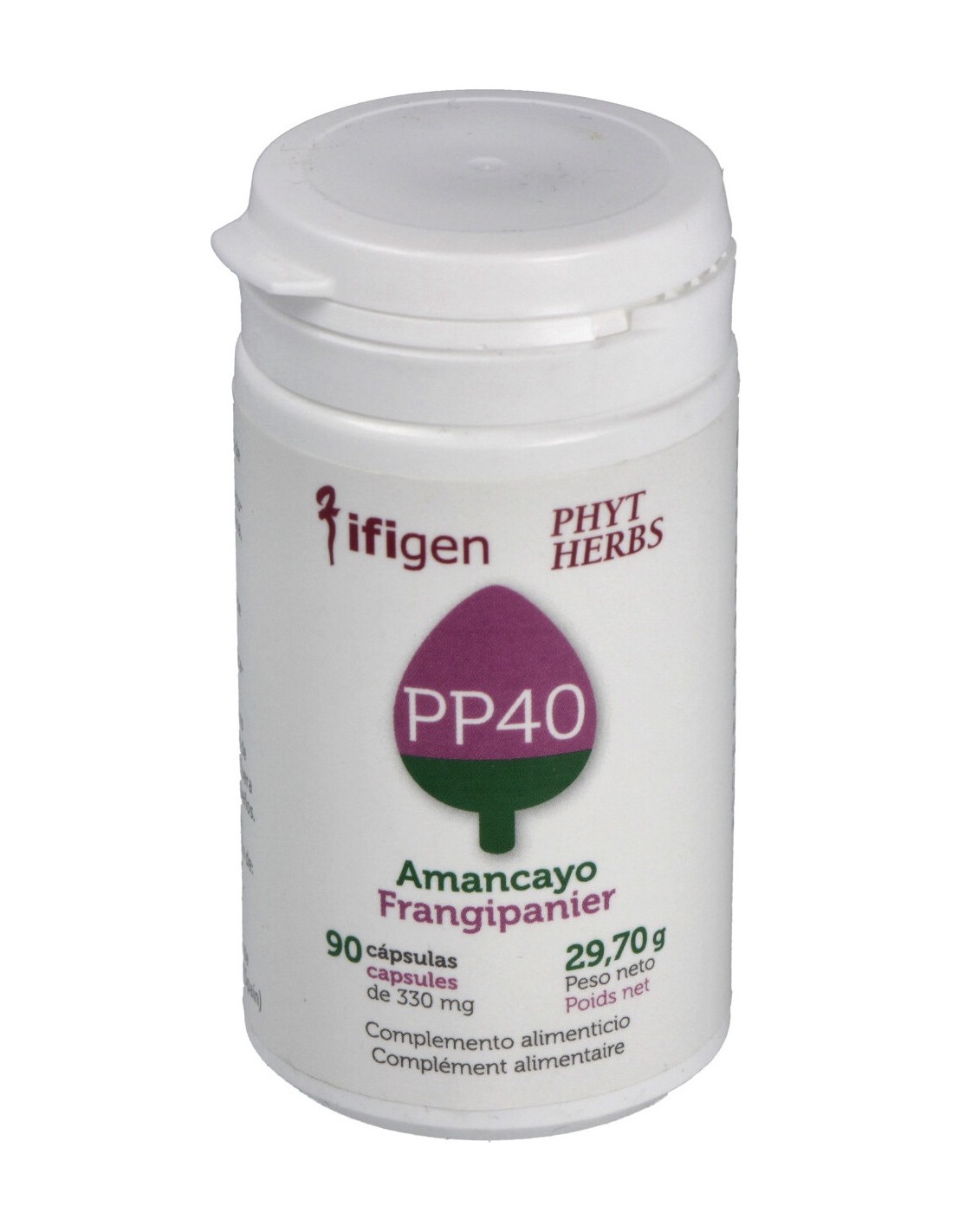 Microencapsulado de extracto de amancayo (290 mg/cápsula) de los que 40 mg son alcaloides (gesmospermina y flavopererina). Agentes de recubrimiento (celulosa microcristalina, gelatina vegetal).
