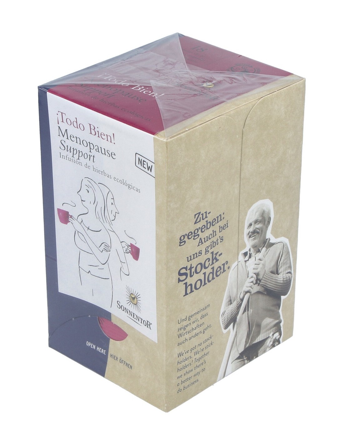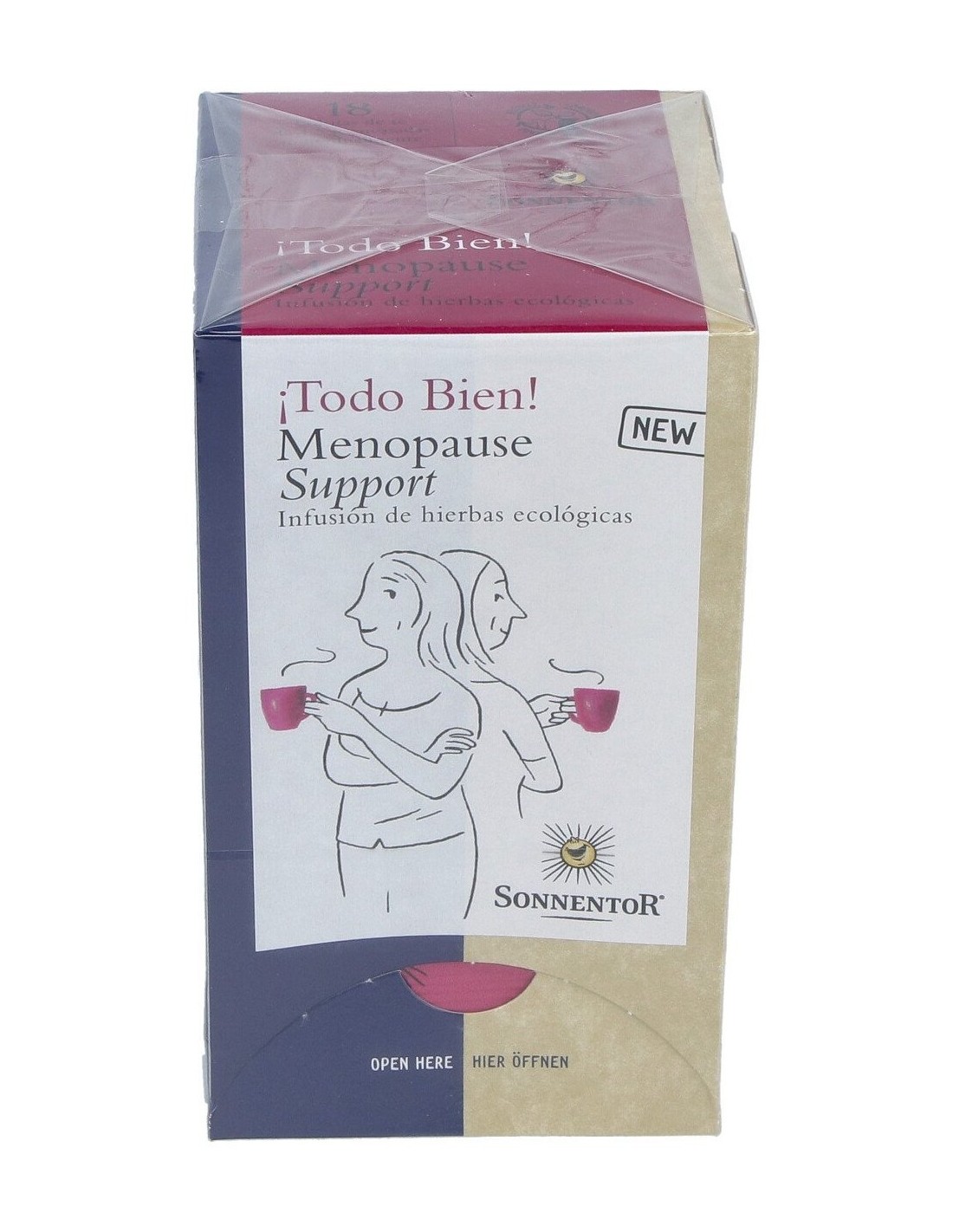 Sonnentor ¡Todo Bien! Menopausia Bio 18 Filtros filtros para infusionar, elaborados con una mezcla de hierbas aromáticas procedentes de cultivos ecológicos, como el manto de dama, hojas de mora, melisa, granada o salvia, que están indicados para ayudar a aliviar los síntomas de la menopausia.