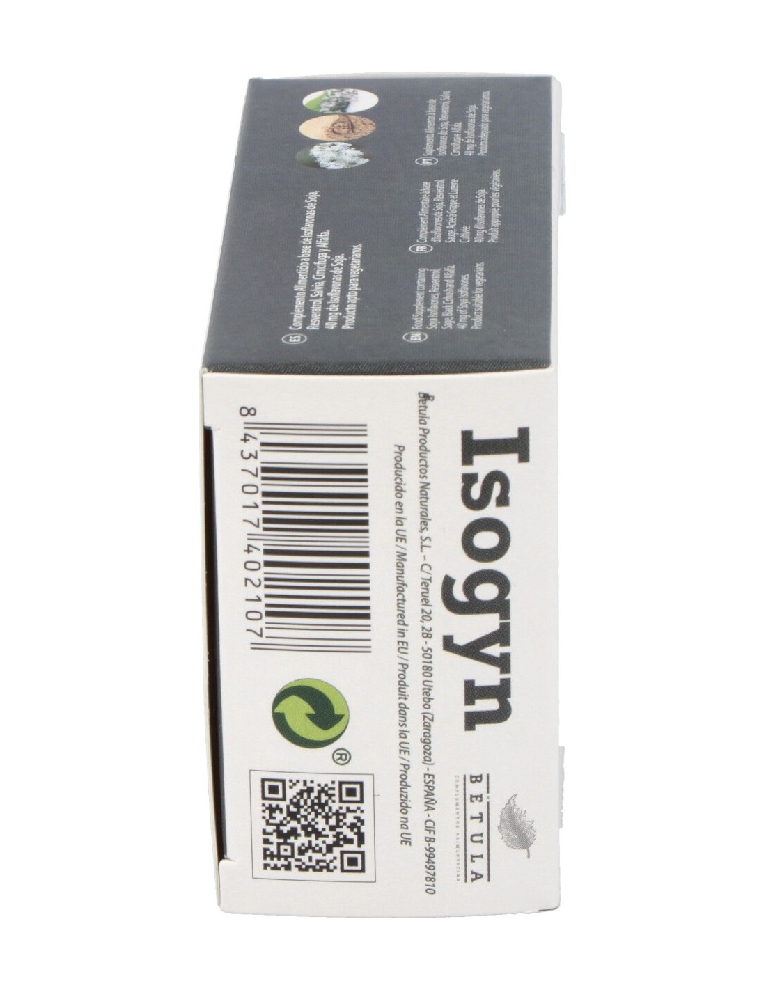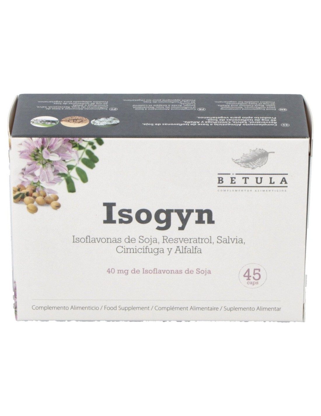 Isogyn está compuesto por Resveratrol, Salvia, Cimicifuga y Alfalfa plantas y productos vegetales con nutrientes muy adecuados para esta etapa vital, que combinan a la perfección con las isoflavonas de soja. Además, su composición natural hace que sea un producto apto para vegetarianos.