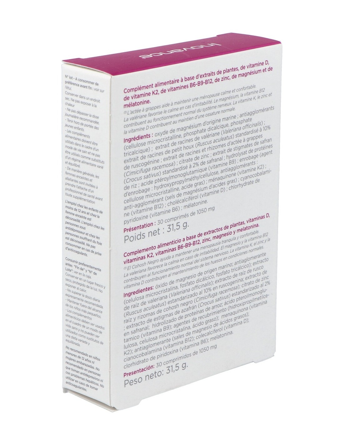 Ingredientes: Óxido de magnesio de origen marino; extracto de valeriana (Valeriana officinalis L.); antiaglomerantes (celulosa microcristalina) ; extracto de rusco (Ruscus aculeatus L.) 10% de ruscogenina; antiaglomerantes (fosfato dicálcico, fosfato tricálcico); extracto de cimífuga (Cimicifuga racemosa L. Nutt.); citrato de zinc; extracto de azafrán (Crocus sativus) 2% de safranal; proteínas de arroz hidrolizadas; ácido fólico (vitamina B9); agentes de recubrimiento (hidroxipropilmetilcelulosa, celulosa microcristalina, ácido estearico) ; vitamina K2 ; antiaglomerante (estearato de magnesio); cianocobalamina (vitamina B12) ; colecalciferol (vitamina D) ; clorhidrato de piridoxina (vitamina B6); mélatonina.