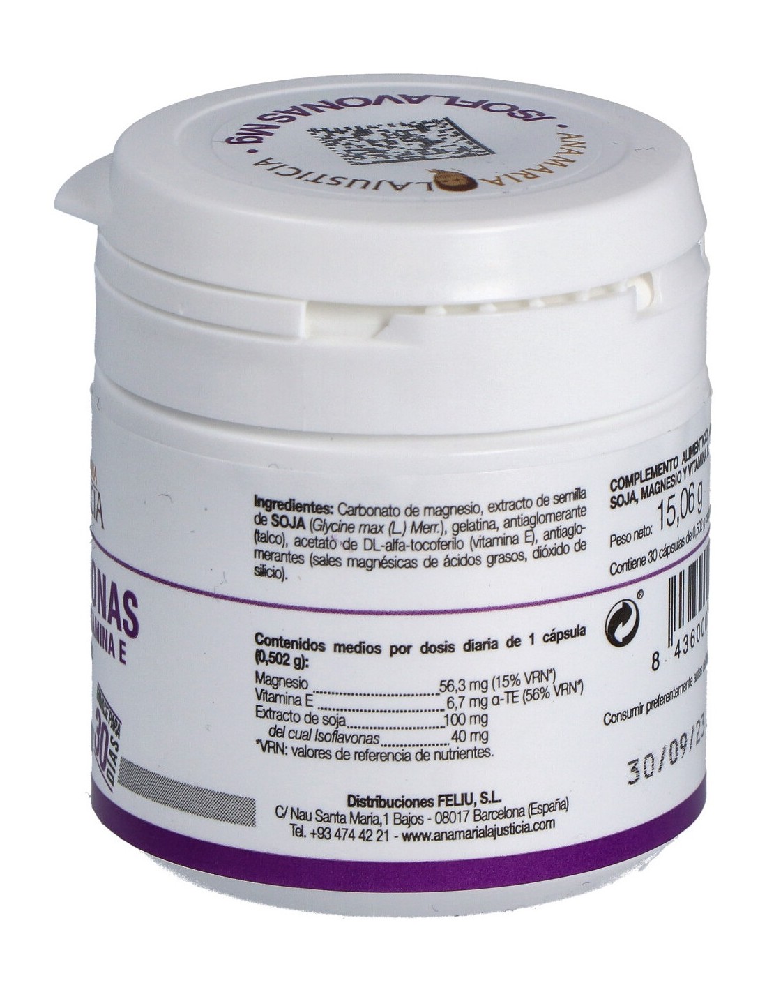 Carbonato de magnesio (magnesio), extracto de soja (Glycine max), gelatina, antiaglomerante (talco), acetato de DL-alfa-tocoferilo (vitamina E), antiaglomerantes (estearato de magnesio y dióxido de silicio).