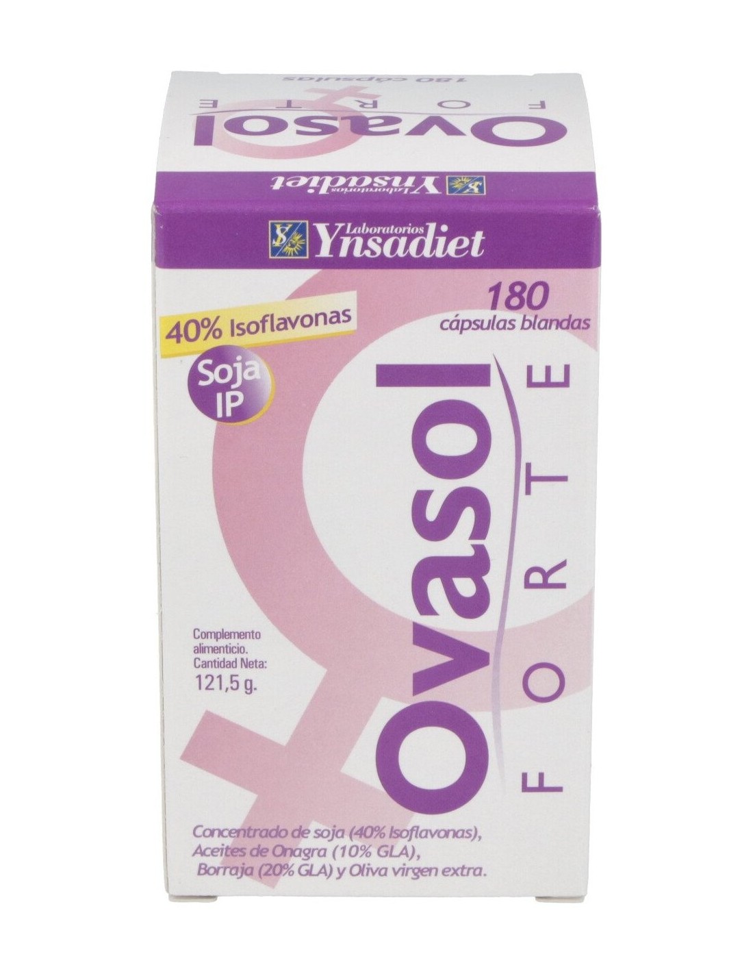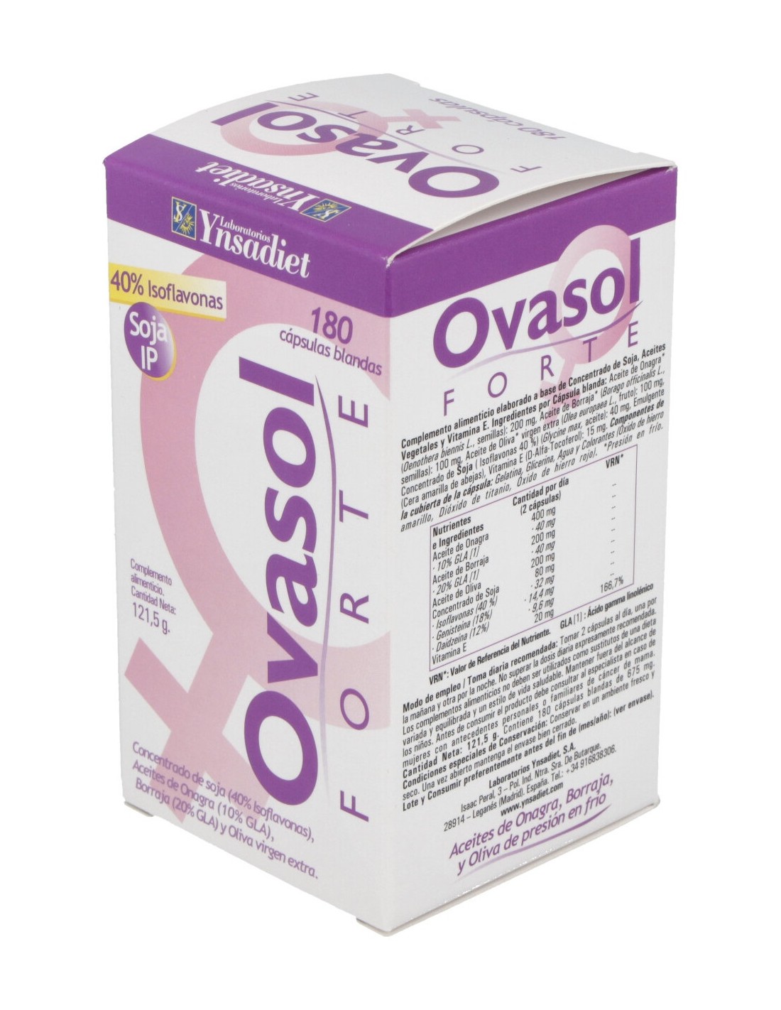 Aceite de Onagra (Oenothera biennis L, semillas) (200 mg), Aceite de Borraja (Borago officinalis L, semillas) (100 mg), Aceite de Oliva virgen extra (Olea europaea L, olivas) (100 mg), Concentrado de Soja (Glycine max L. Merr, aceite) (Isoflavonas 40 %) (40 mg), Emulgente (Cera amarilla de abejas), Vitamina E - D Alfa-Tocoferol (15 mg, eq. a 10 mg de Tocoferol o Vit. E).