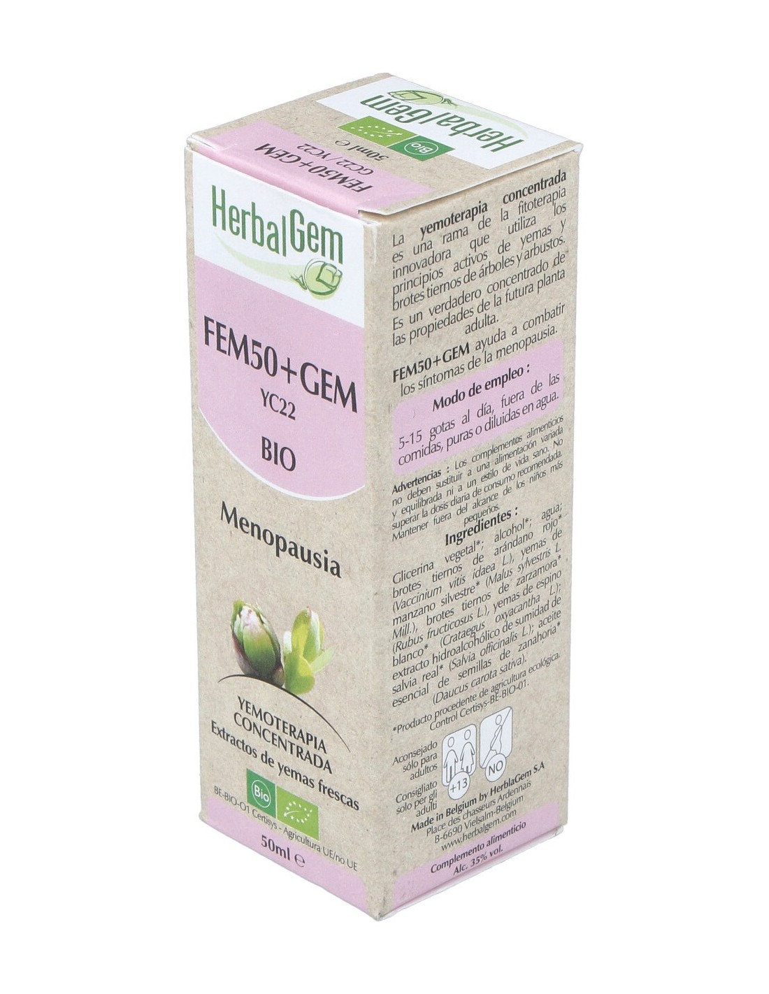 Herbalgem Fem50+ Gem Gc22 50ml es un complemento alimenticio elaborado a base de extractos de yemas frescas de plantas, minerales, oligoelementos y otros ingredientes naturales, que ayudan a combatir los síntomas de la menopausia y a regular el organismo a nivel hormonal.