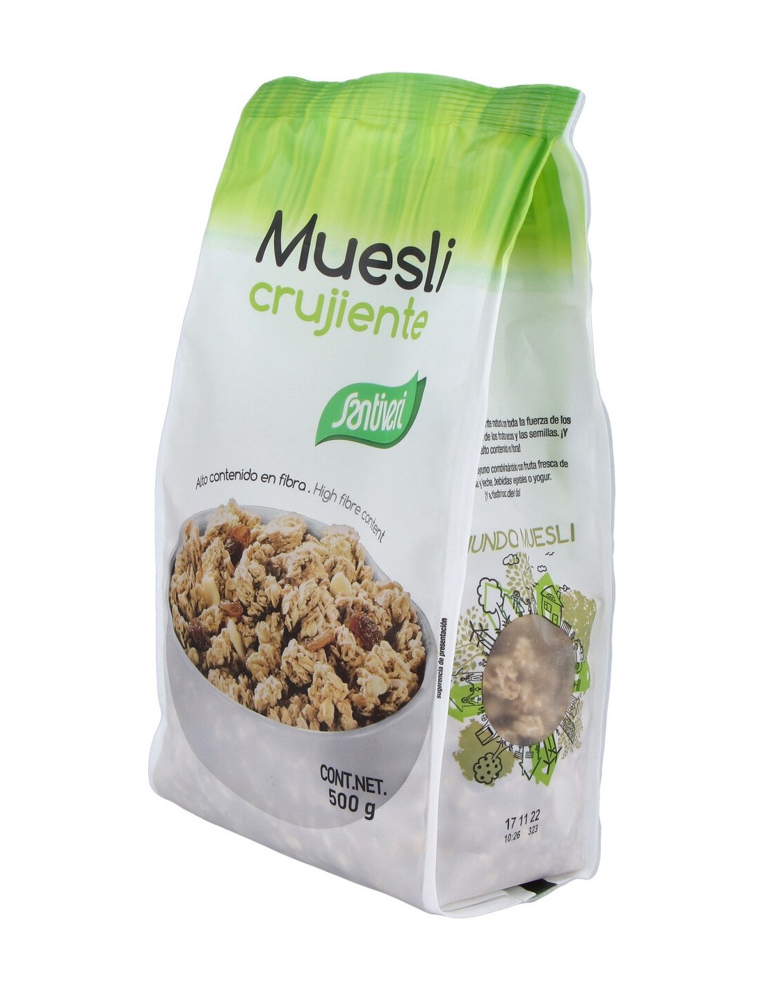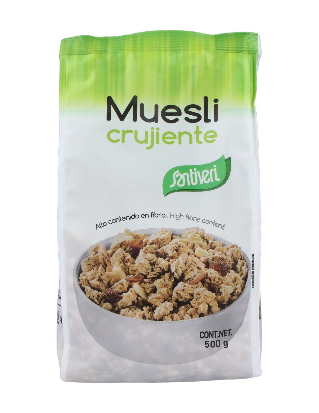 Combinación de cereales y pasas, ideal para tomar en el desayuno, ya que aporta la suficiente energía para llegar hasta la hora del almuerzo sin sentir hambre. Aporta vitamina E, minerales como el potasio o el hierro y una gran cantidad de fibra que ayuda a reducir el colesterol y mejorar la digestión. Acción antioxidante. El Muesli es un preparado dietético de origen suizo a base de cereales integrales, frutas, frutos secos, germen de trigo y azúcar moreno de caña que constituye un alimento altamente nutritivo y sumamente equilibrado, ya que contiene todos los ingredientes de los alimentos y en una proporción equilibrada.