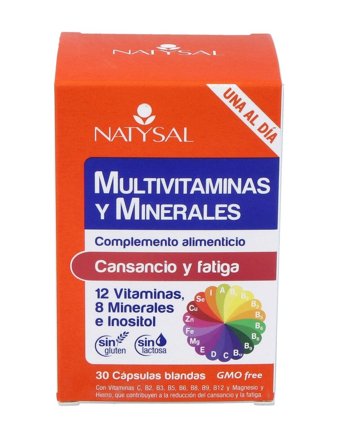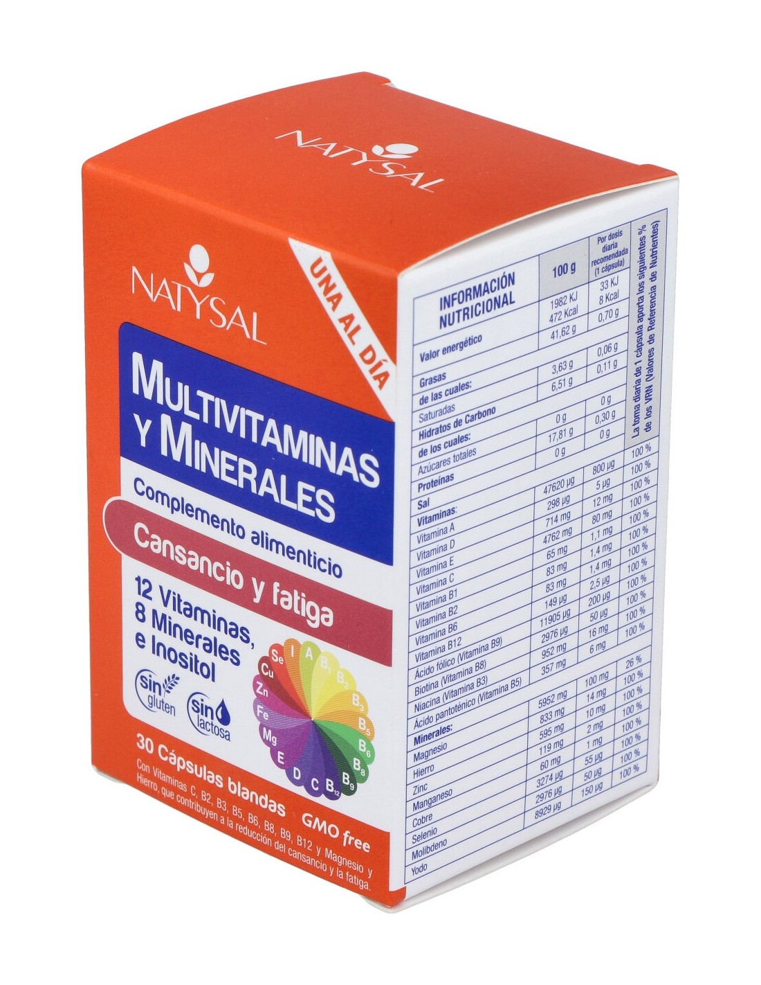 Aceite refinado de semillas de girasol (Helianthus annuus L.), óxido de magnesio, antiaglomerante calcio fosfato dibásico, vitamina C (ácido L-ascórbico), emulgente cera amarilla de abejas, inositol, sulfato de hierro, sulfato de zinc, emulgente lecitina de semillas de Soja, vitamina E (D-alfa tocoferol), niacina (nicotinamida), ácido pantoténico (D-pantotenato de calcio), sulfato de manganeso, vitamina A (palmitato de retinilo), sulfato de cobre, vitamina B12 (cianocobalamina), vitamina B6 (clorhidrato de piridoxina), vitamina B2 (riboflavina), vitamina B1 (mononitrato de tiamina), yodato de potasio, vitamina D3 (colecalciferol), ácido fólico (ácido pteroilmonoglutámico), molibdato de sodio, selenito de sodio, biotina (D-biotina). Cubierta de la cápsula: gelatina, humectante glicerina, colorante óxido de hierro negro.